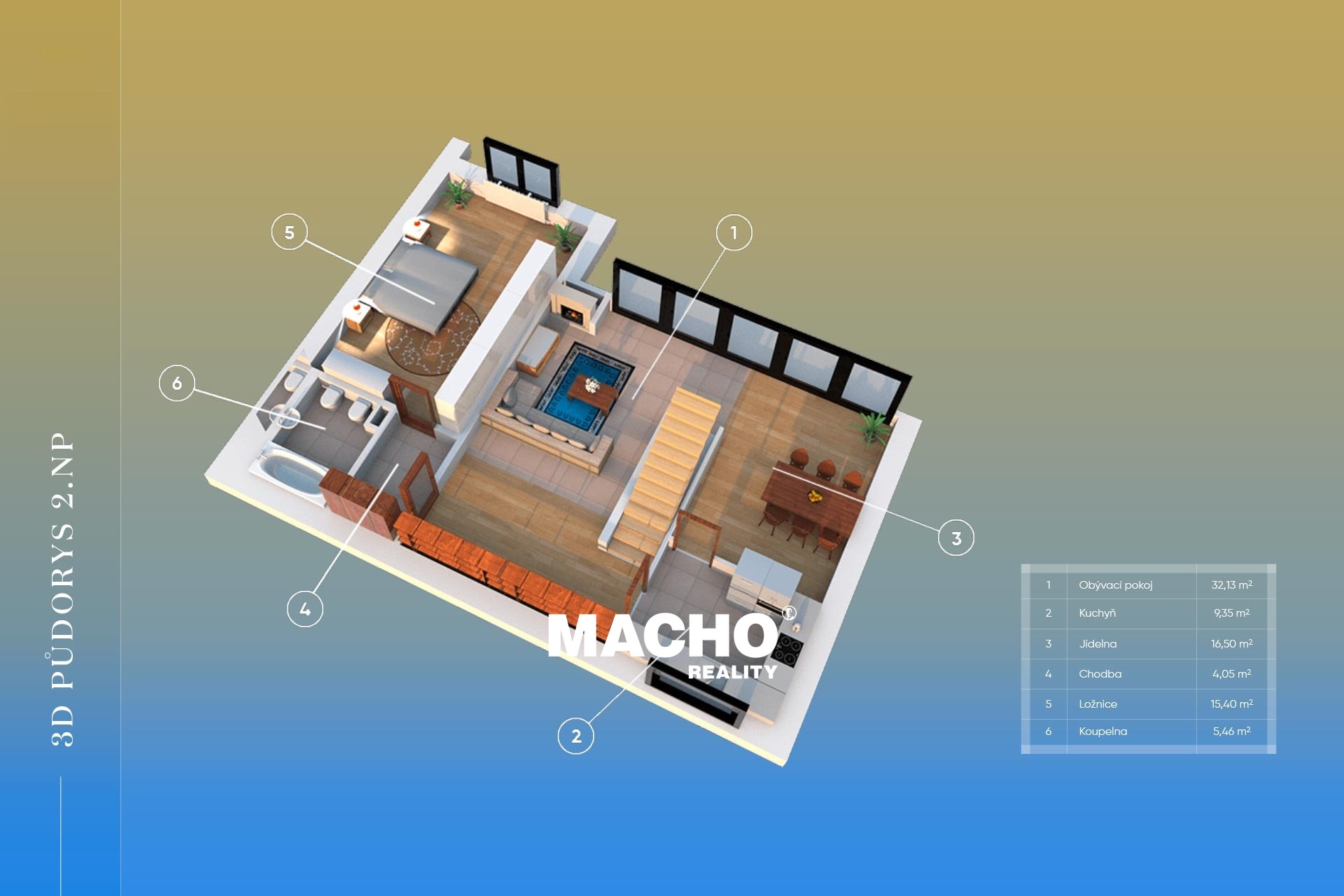 Ve 2. nadzemním podlaží nalezneme prostorný obývací pokoj, kterému dominuje stylový krb. Vedle něj se nachází vstup na útulnou terasu, jako stvořenou pro posezení s rodinou nebo přáteli. Patro dále nabízí kuchyň, vybavenou kuchyňskou linkou s vestavěnými spotřebiči, jídelnu, ložnici, koupelnu s vanou, toaletou a bidetem.