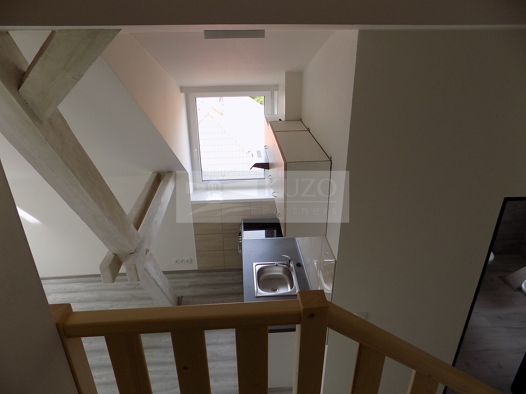 KUZO Partners Vám počínaje 1.3.2026 zprostředkují exkluzivně možný pronájem novostavby atypického mezonetového bytu 2+kk v nově zrekonstruovaném bytovém domě, bývalém Špýcharu, který se nachází v těsné blízkosti centra města Dobříš. Byt v OV o celkové podlahové ploše 58 m2 se nachází ve čtvrtém nadzemním podlaží čtyřpatrového cihlového domu s výtahem a bezbariérovým přístupem. Nestandardní členění bytu je následující: vstupní chodba, odtud vlevo vcházíme do kuchyně s komorou, novou kuchyňskou linkou a sporákem spojené s jídelním koutem a obývacím prostorem, odtud po schodech vystoupáme do atypického podkroví, ložnice, orientované na západ s famózním výhledem na město a okolí. Z chodby vpravo vstoupíme do samostatné koupelny se sprchovým koutem, umyvadlem, koupelnovým radiátorem a WC. Bytový dům, který disponuje deseti bytovými jednotkami, prošel nadstandardní kompletní rekonstrukcí a rozhodně uspokojí náročné klienty s požadavky vysokého standardu bydlení. Parkování je možné v těsné blízkosti domu v neplacené zóně. V blízkosti domu je veškerá občanská vybavenost. Nájemné včetně poplatků činí měsíčně 19500,- Kč ( 16000,- Kč nájemné a 3500,- Kč záloha služby/ 2 osoby). Vratná kauce činí 39000,- Kč. Ostatní informace v RK.