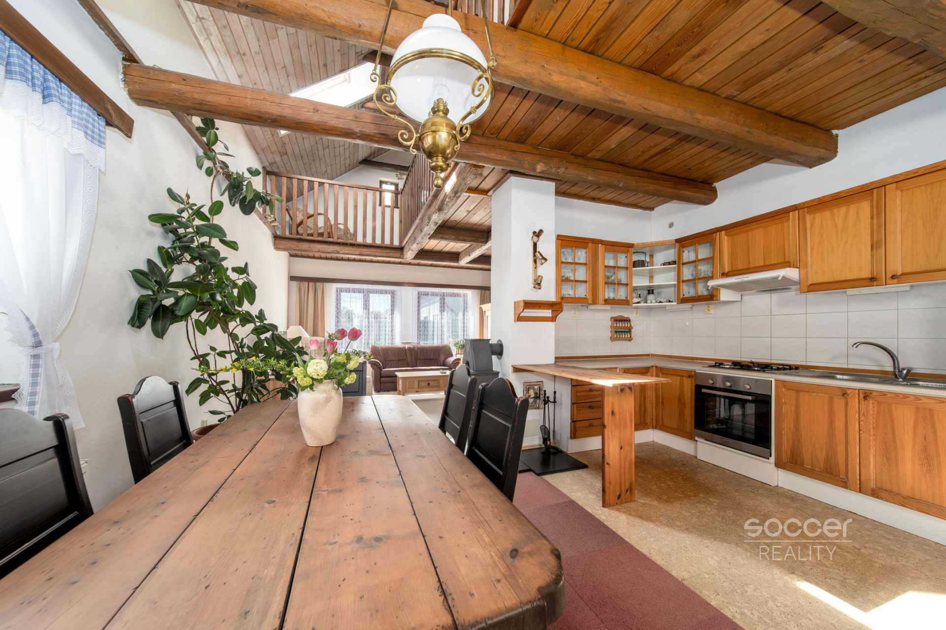 Samotný nenápadný dům vás okouzlí mimořádně útulným zázemím. Je vybaven stylovým nábytkem, který ladí s duchem místa. Dispozičně je řešen jako 3+kk, plus velká obytná galerie. Najdete zde vstupní chodbu s masivním schodištěm a dvě koupelny vždy s toaletou (jednu v přízemí a druhou v podkroví). Na obytnou galerii vede schodiště také přímo z hlavního obytného pokoje. Ten je plynule propojen s kuchyňským a jídelním koutem. Na obytné galerii je možnost vytvořit další pokoj (s vitrážovými okny a jedním střešním). Interiér mile překvapí atypickým řešením a jedinečnou atmosférou.