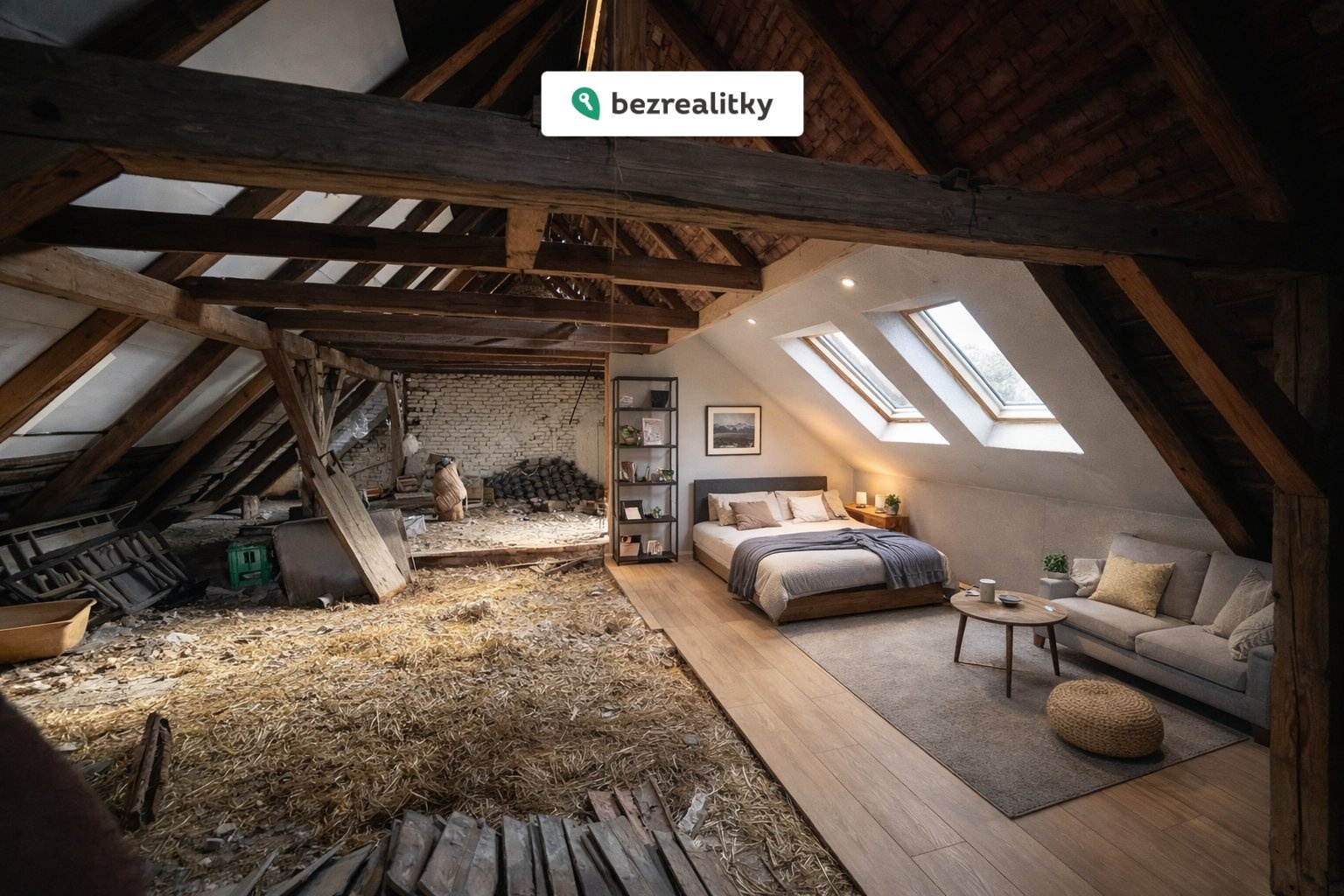 V domě jsou již k dispozici základní inženýrské sítě — voda, kanalizace a elektřina. Velkou výhodou je také půdní prostor, který nabízí možnost vybudování dalšího obytného zázemí, například ložnice, pracovny, dětských pokojů nebo další plnohodnotné obytné části.
