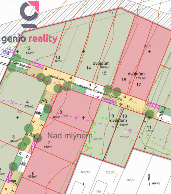 Parcely: 850 m2 (samostaně stojící RD), 850 m2 (samostatně stojící RD), 853 m2 (samostatně stojící RD), 1730 m2 (dvojdům)