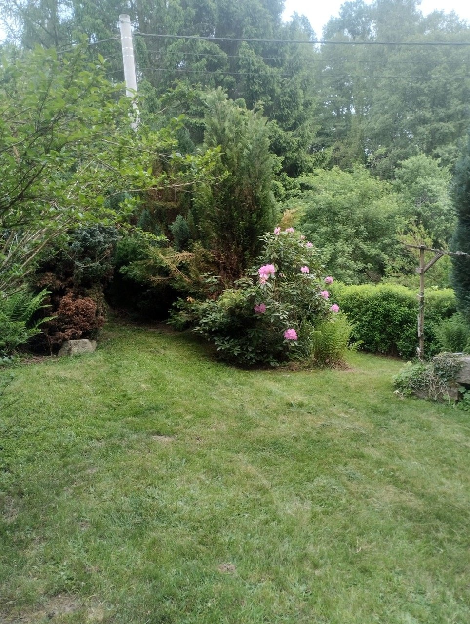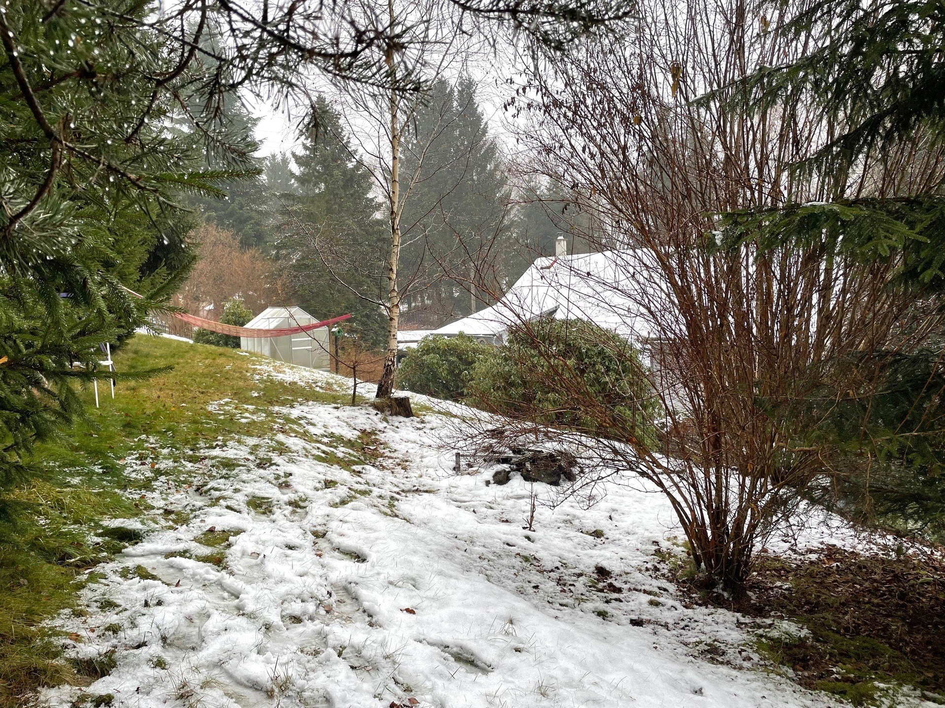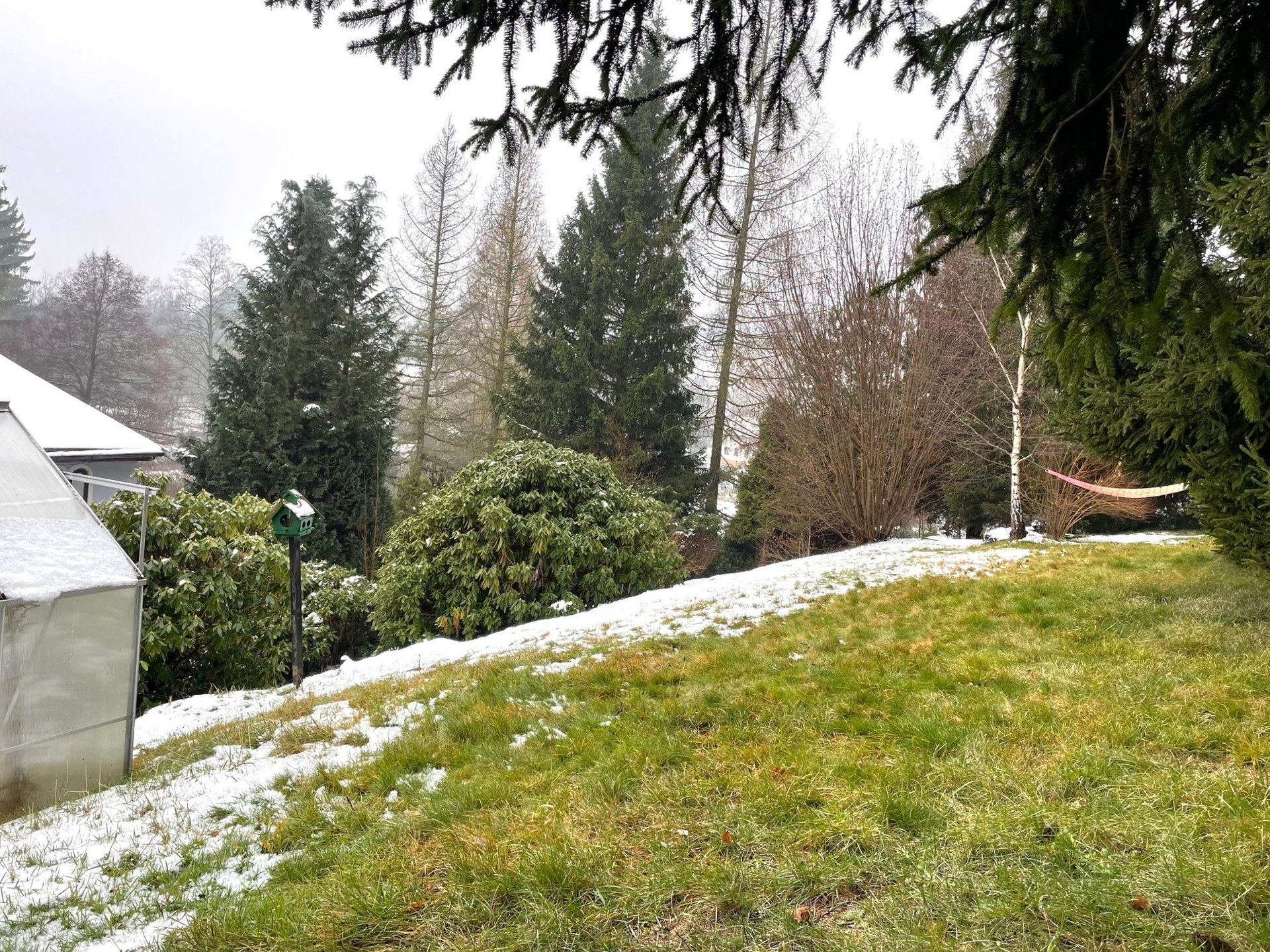 Oplocený pozemek nabízí dvě vyhrazená parkovací místa, zahrnuje skleník, dřevěný domek pro dětí a je z větší části svahovitý, což otvírá prostor pro kreativní zahradní úpravy. Na zahradě je navíc připravené místo pro bazén, venkovní sezení a k dispozici jsou i přístřešky na uskladnění dřeva.