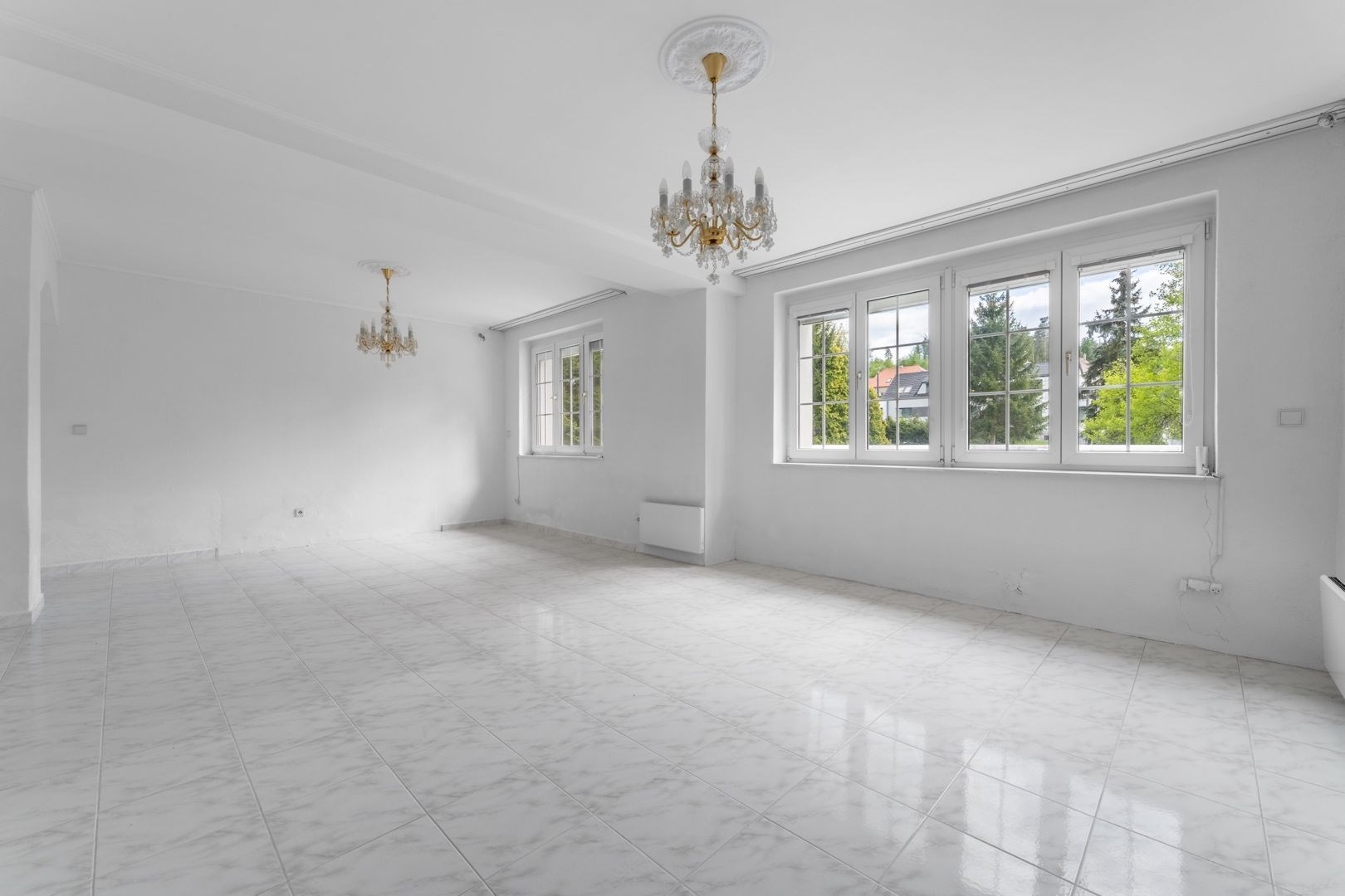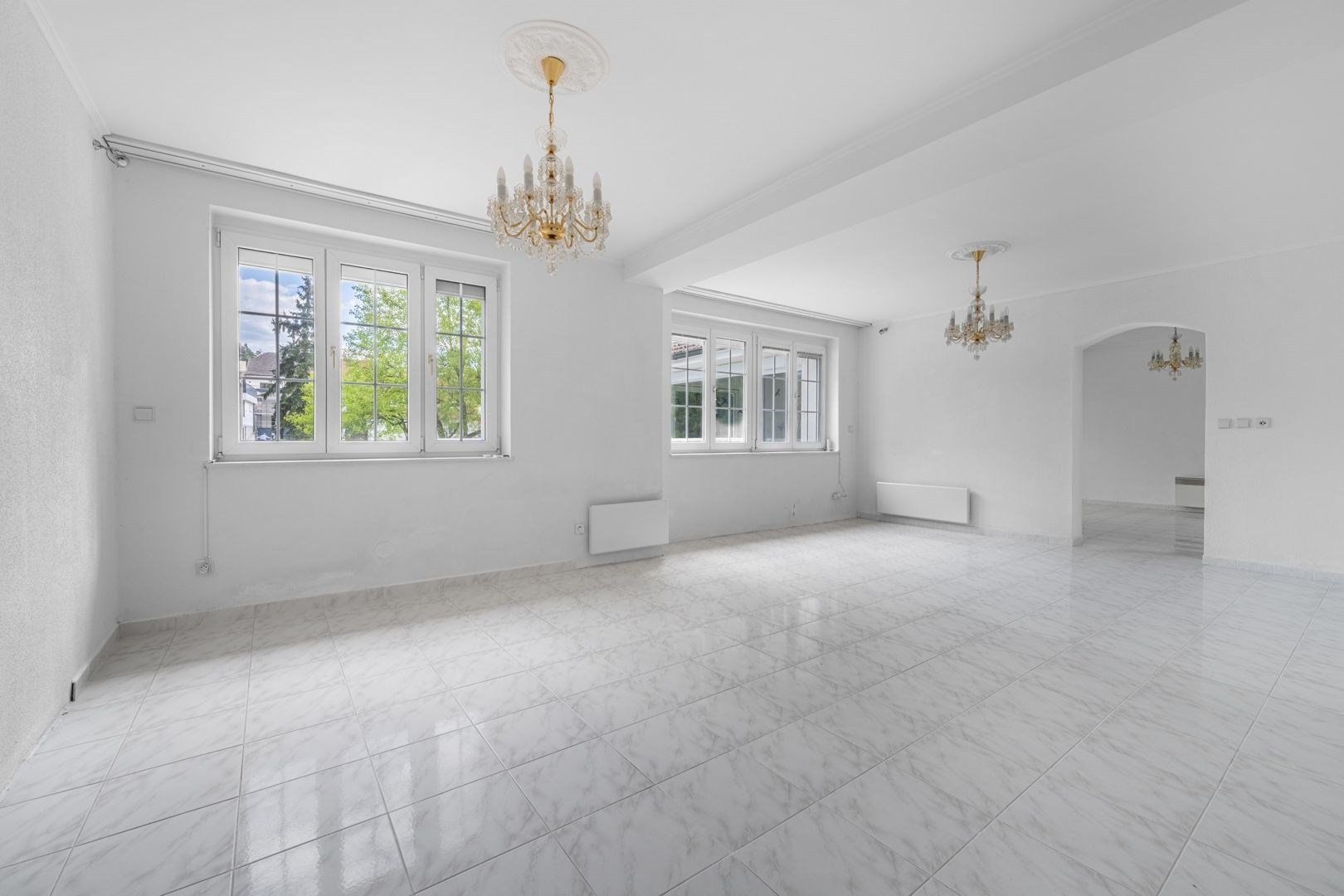 Přízemí: prostorný obývací pokoj, jídelna, kuchyň, spíž, zimní zahrada s přímým vstupem na terasu, koupelna a technická místnost. Podlahy tvoří praktická dlažba v šedobílém provedení.