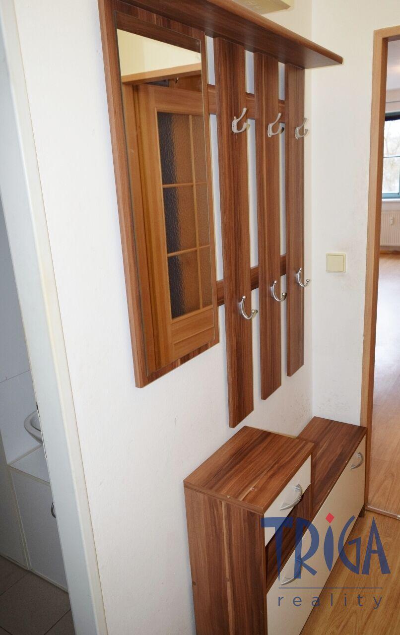 Dispozice bytu: vstupní předsíň, samostatné WC s umyvadlem a pračkou, prostorný obývací pokoj s kuchyňským koutem (kuchyňská linka, elektrický sporák, digestoř), ložnice, šatna s vestavěnou skříní a koupelna s vanou a umyvadlem.