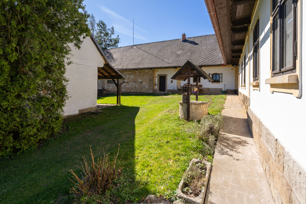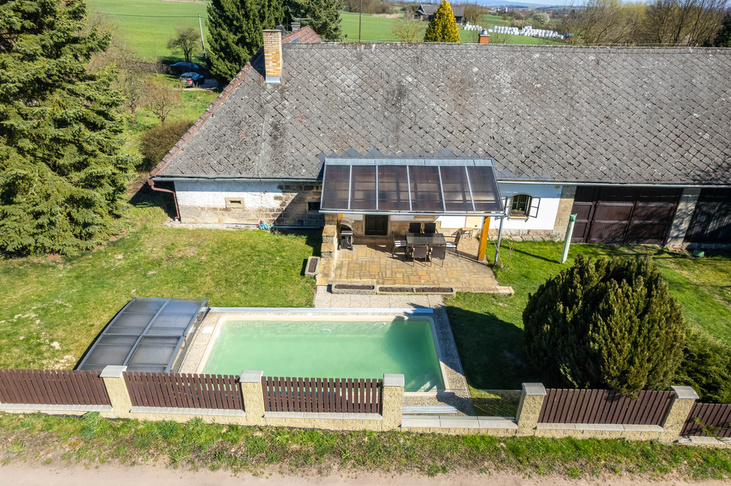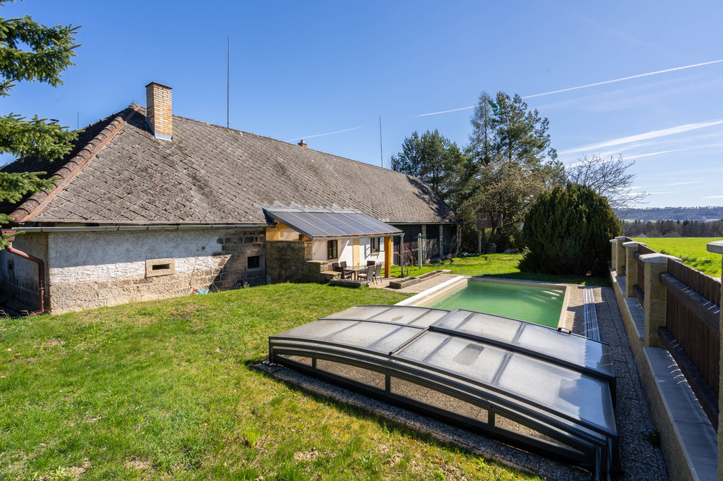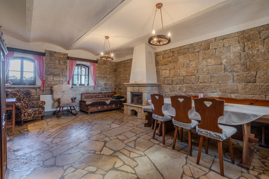 Přízemí rodinného domu je tvořeno prostorným samostatným pokojem, stylovou kuchyní s pecí a stylovou společenskou místností s krbem a s přímým vstupem na částečně krytou terasu. Dále je v přízemí koupelna se saunou, samostatné WC a technické místnosti. V patře domu se nachází 2 samostatné pokoje, koupelna s toaletou a prostorná půda. K domu přiléhá upravená stodola, kterou lze využít ke komerčnímu využití a pořádání společenských akcí (svatby, rodinné oslavy či firemní akce). V zadní části domu se nachází terasa s bazénem s nádhernými výhledy do okolí. Vedlejší stavba nabízí apartmánovou jednotku se dvěma samostatnými pokoji, koupelnu s toaletou, samostatným WC, vstupní prostor s kuchyňským a jídelním koutem. K objektu patří také dřevník ve vedlejší stavbě a dílna vedle stodoly. Celkově jsou k dispozici 3 koupelny a 4 toalety.