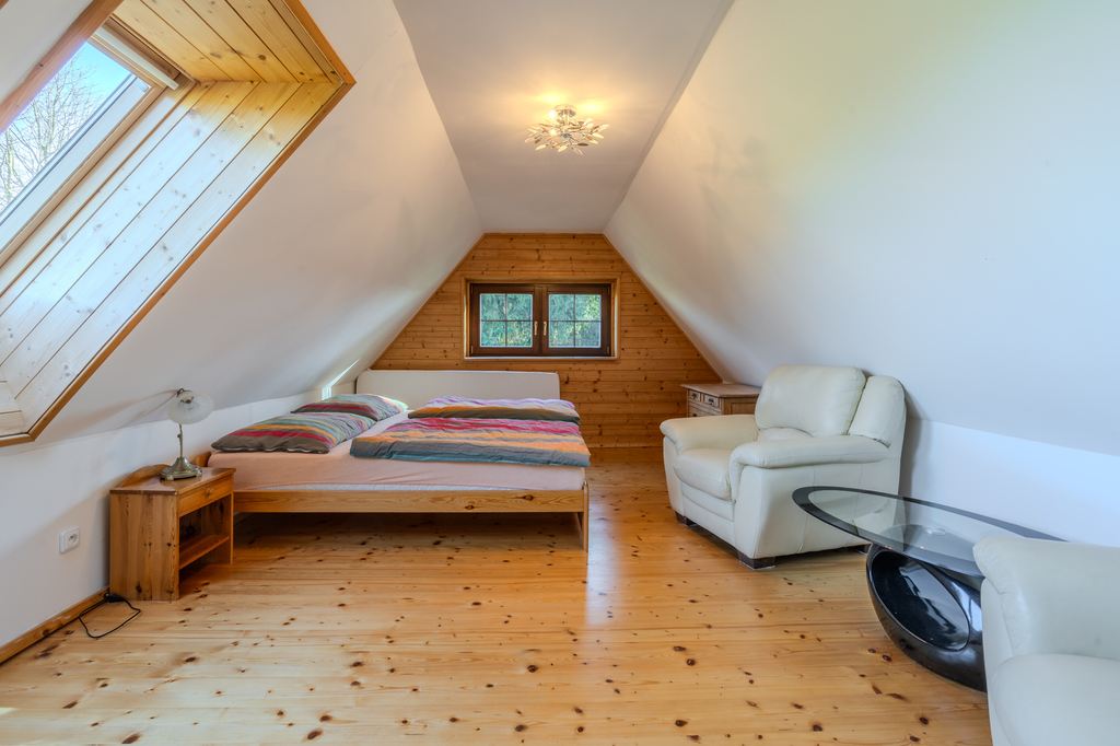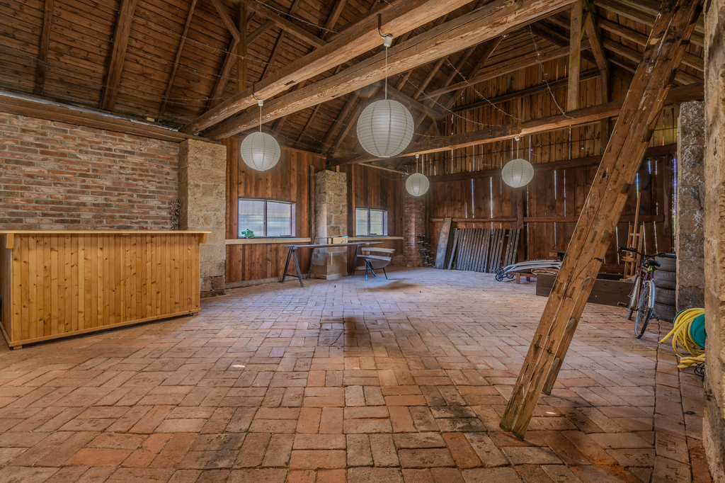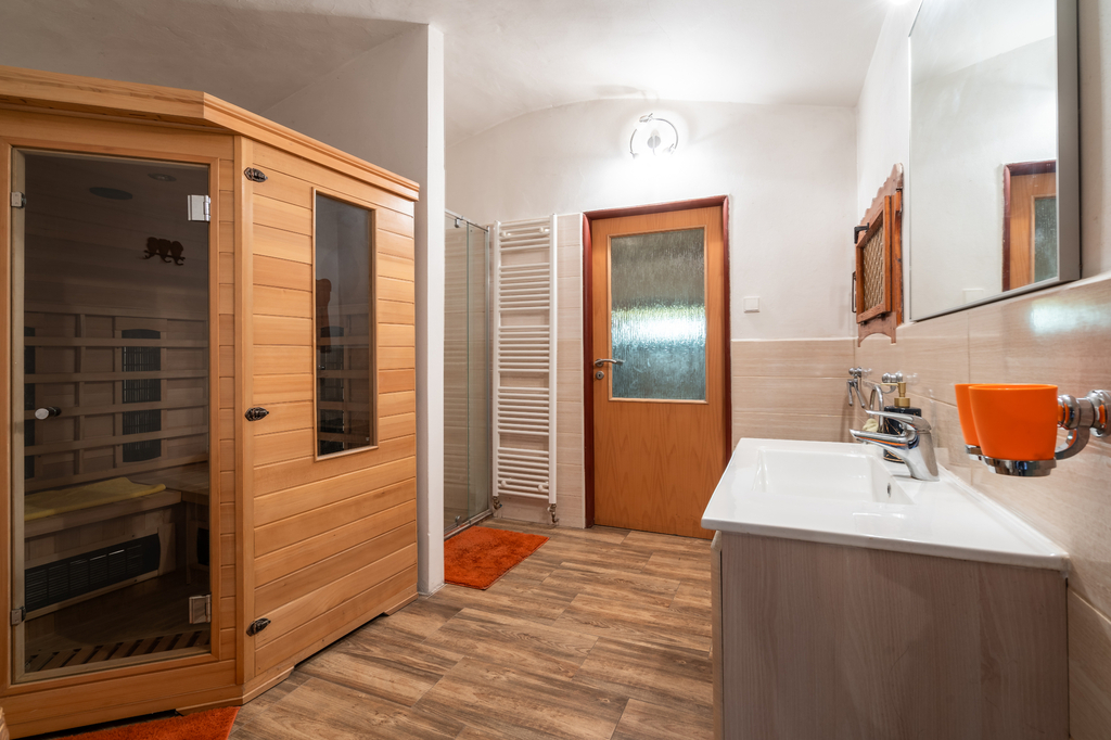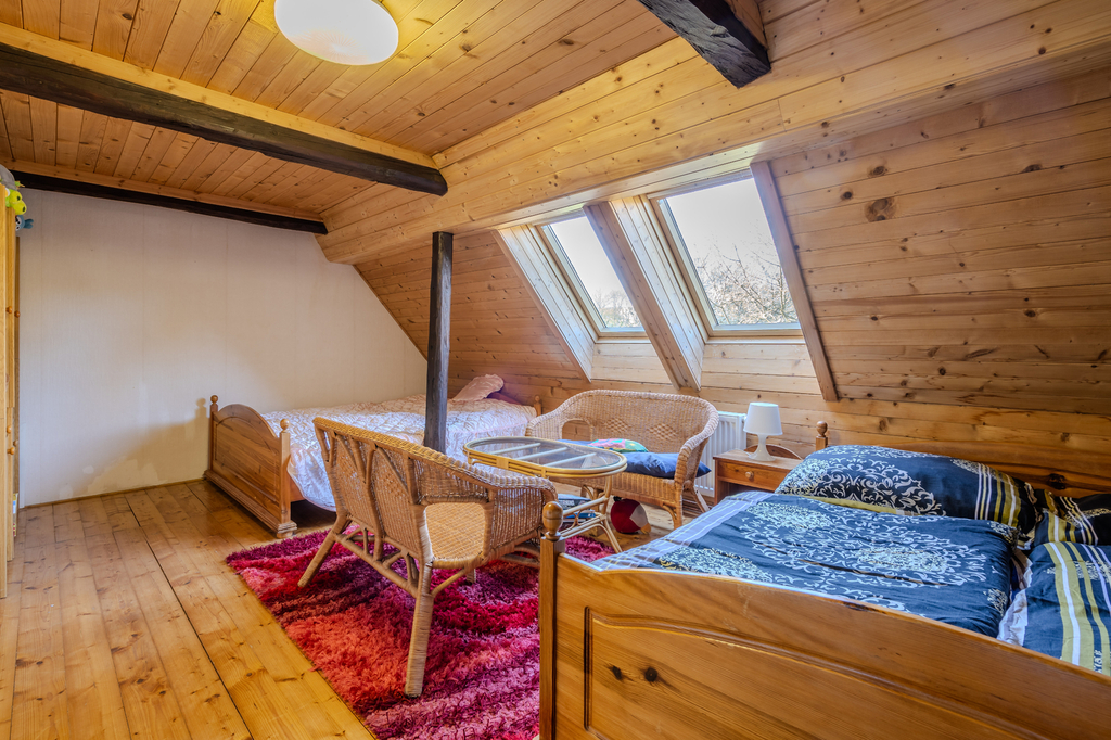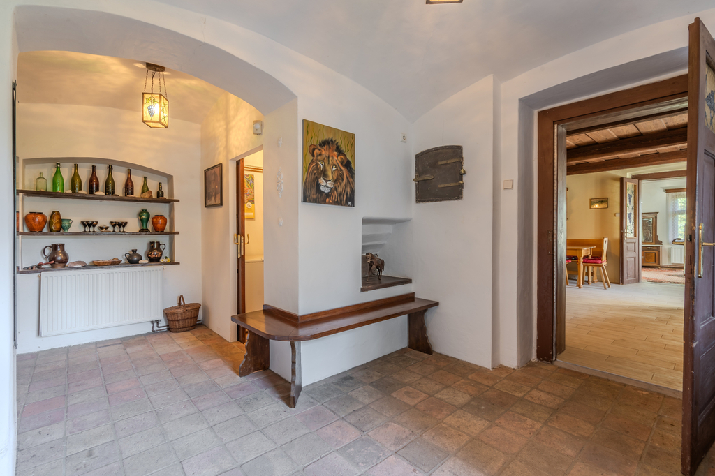Přízemí rodinného domu je tvořeno prostorným samostatným pokojem, stylovou kuchyní s pecí a stylovou společenskou místností s krbem a s přímým vstupem na částečně krytou terasu. Dále je v přízemí koupelna se saunou, samostatné WC a technické místnosti. V patře domu se nachází 2 samostatné pokoje, koupelna s toaletou a prostorná půda. K domu přiléhá upravená stodola, kterou lze využít ke komerčnímu využití a pořádání společenských akcí (svatby, rodinné oslavy či firemní akce). V zadní části domu se nachází terasa s bazénem s nádhernými výhledy do okolí. Vedlejší stavba nabízí apartmánovou jednotku se dvěma samostatnými pokoji, koupelnu s toaletou, samostatným WC, vstupní prostor s kuchyňským a jídelním koutem. K objektu patří také dřevník ve vedlejší stavbě a dílna vedle stodoly. Celkově jsou k dispozici 3 koupelny a 4 toalety.