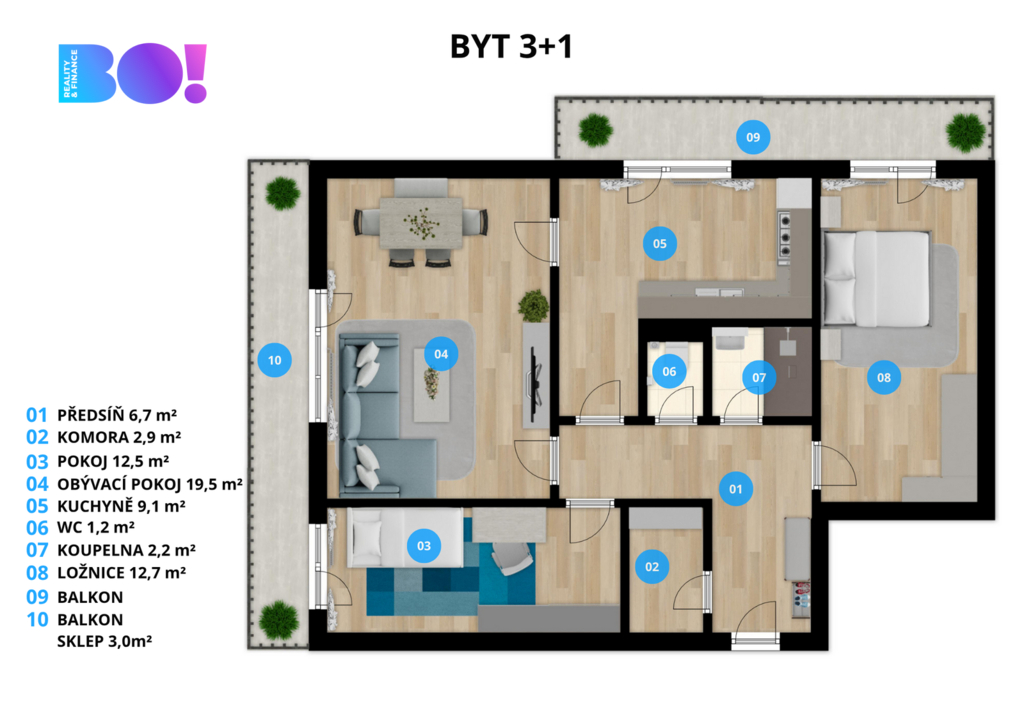 Byt má dispozici 3+1 s užitnou plochou 67,4 m2 a balkony ve všech místnostech o výměře 12,5 m2. K tomu je třeba ještě připočíst 3m2 velký sklep.