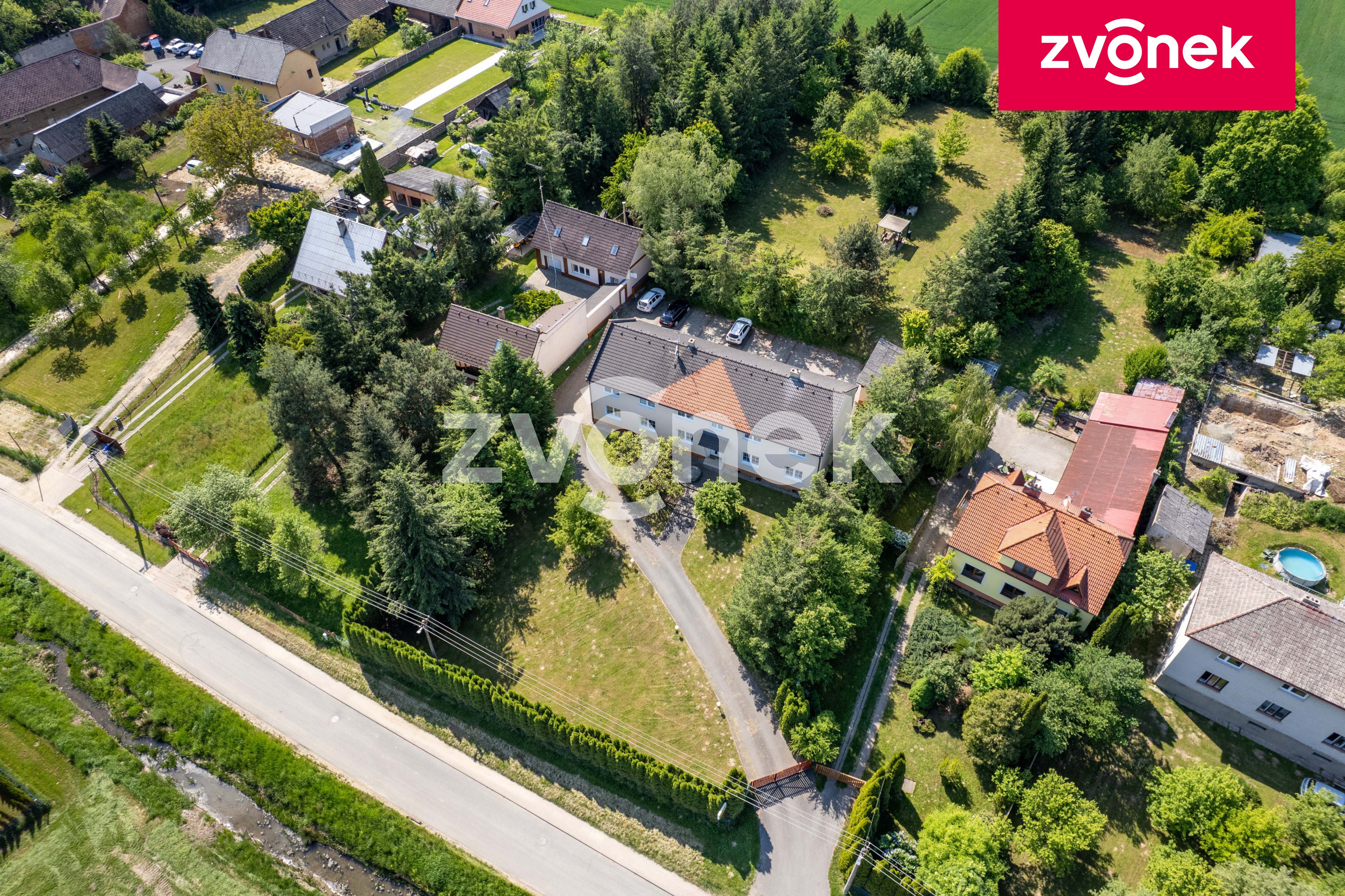 Vjezd na pozemek je zajištěn dálkově ovládanou bránou po soukromé asfaltové cestě a je obklopen vysokými stromy, které zajišťují pocit soukromí a klid.