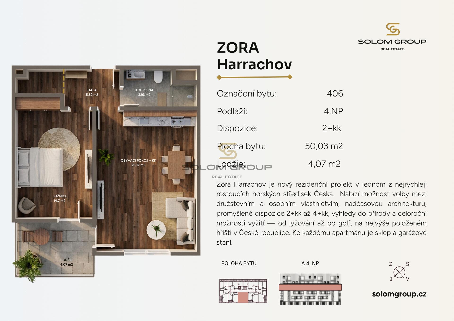 Prodej nového apartmánu 2+kk/Lodžie, 54,10 m² (byt o výměře 50,03 m² + lodžie o výměře 4,07 m²), který se nachází ve 4. NP cihlové novostavby v Rezidenci ZORA Harrachov, Krkonoše (Dům A)