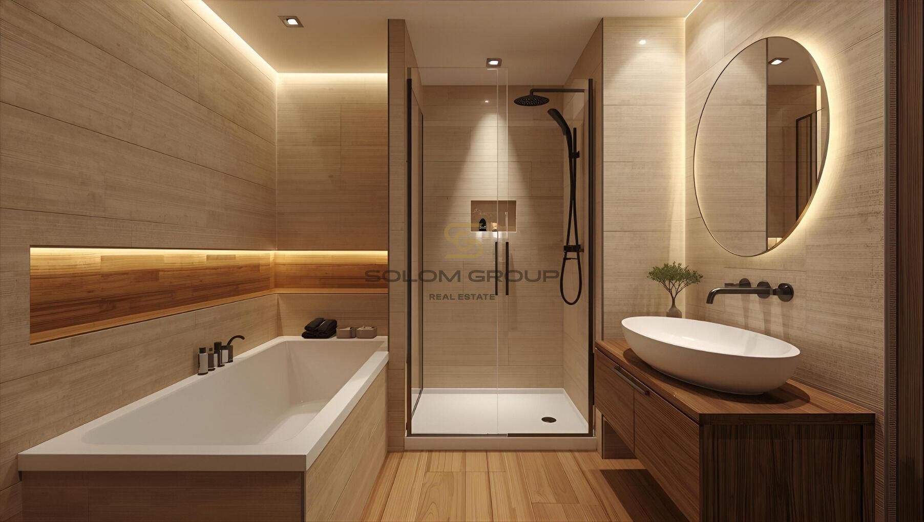 Apartmán je Vám předán hotový vč. zařízené koupelny (umyvadlo, vana nebo sprchový kout, topný žebřík a 2x WC) dále interiérové dveře, hliníková okna s izolačními trojskly, nové rozvody vody, elektřiny a odpadů, podlahové vytápění, příprava pro kuchyňskou linku, protipožární vchodové dveře, obklady, příprava pro předokenní žaluzie, vinylové podlahy a dlažba.