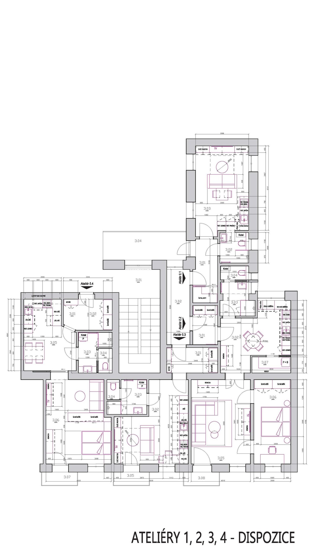 3.NP - 430m2 – kanceláře, služby + část podlaží volná z důvodu plánového přebudování na 4 ateliéry