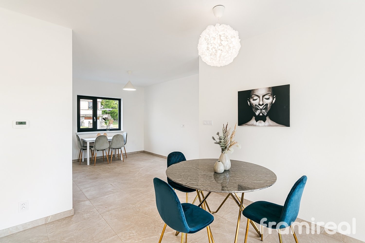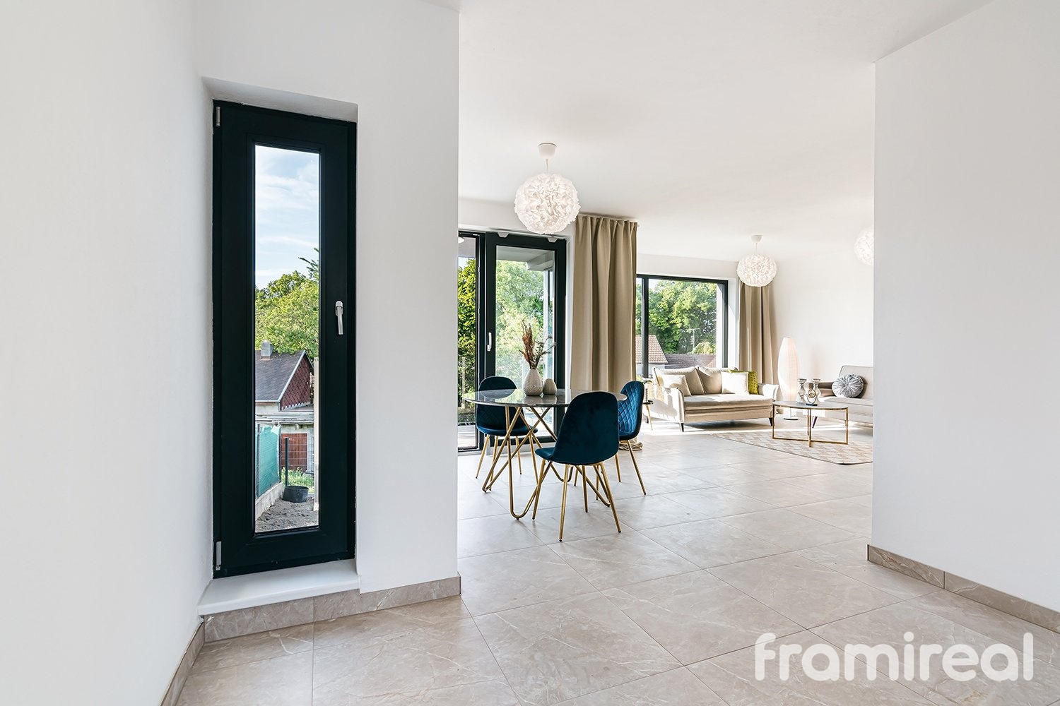 Dům je rozdělen do tří logicky uspořádaných podlaží. V přízemí se nachází prostorné zádveří s dostatkem místa pro odložení věcí, dále následuje velkorysý obývací pokoj s přípravou pro kuchyň a jídelnu. Díky velkoformátovým oknům je interiér prosvětlený a lodžie nabízí ideální prostor pro ranní kávu nebo večerní relaxaci. Přízemí dále doplňuje samostatná toaleta a příprava na předokenní žaluzie, které oceníte zejména v letních měsících.