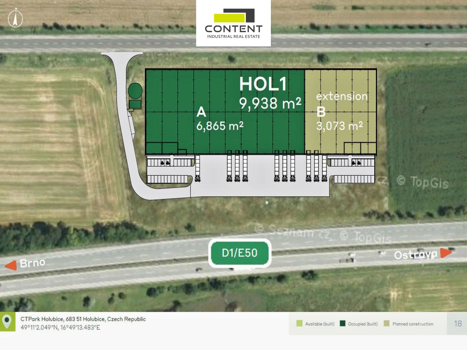 V zastoupení majitele a bez provize nabízíme novostavbu skladu nebo výrobních prostor s velkou variabilitou využití v novém komerčním parku u D1. K dispozici samostatné industriální prostory, vhodné především pro skladování, logistiku, výrobu a velkoobchodní provoz. Skvělá lokalita u dálnice D1, EXIT 210.