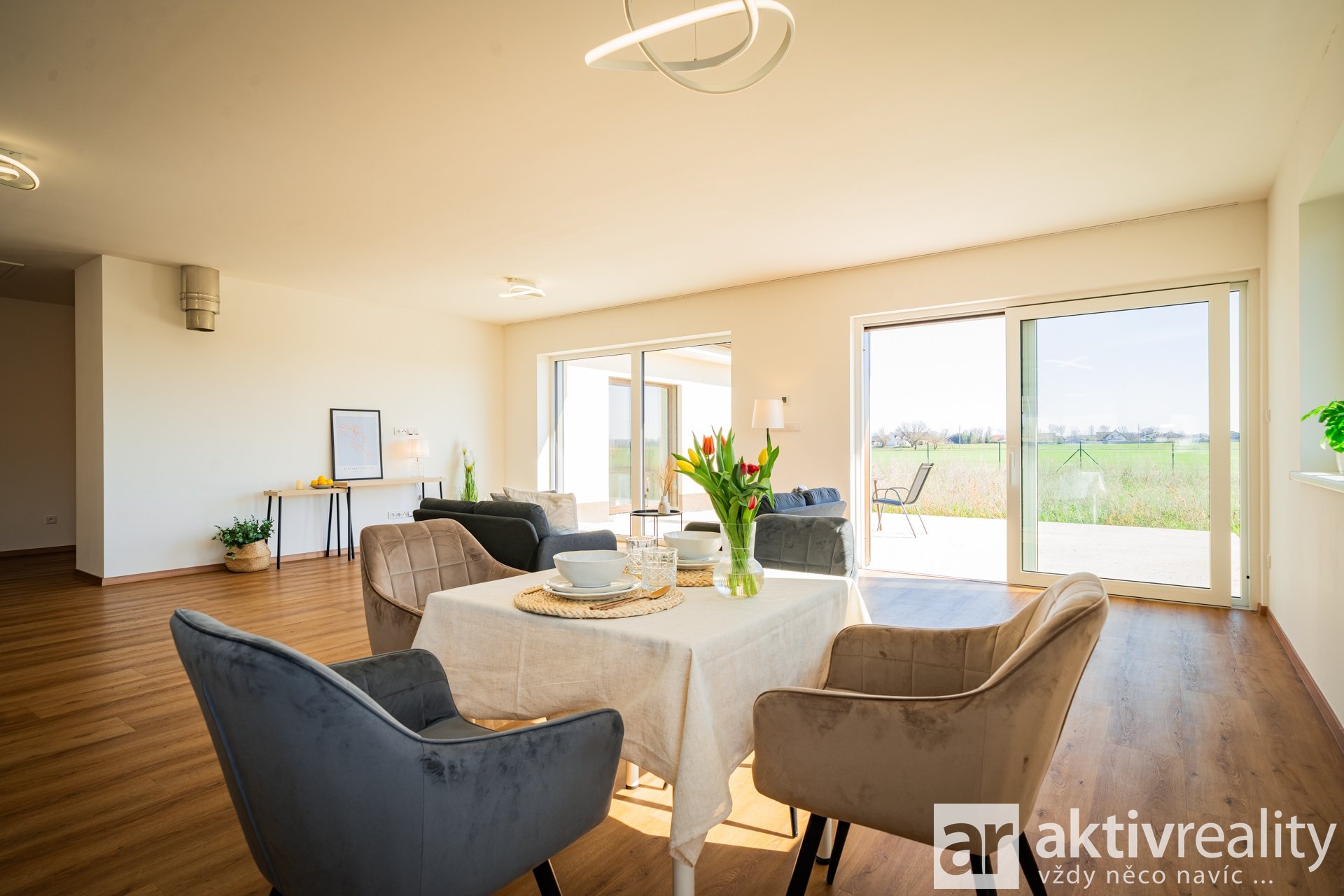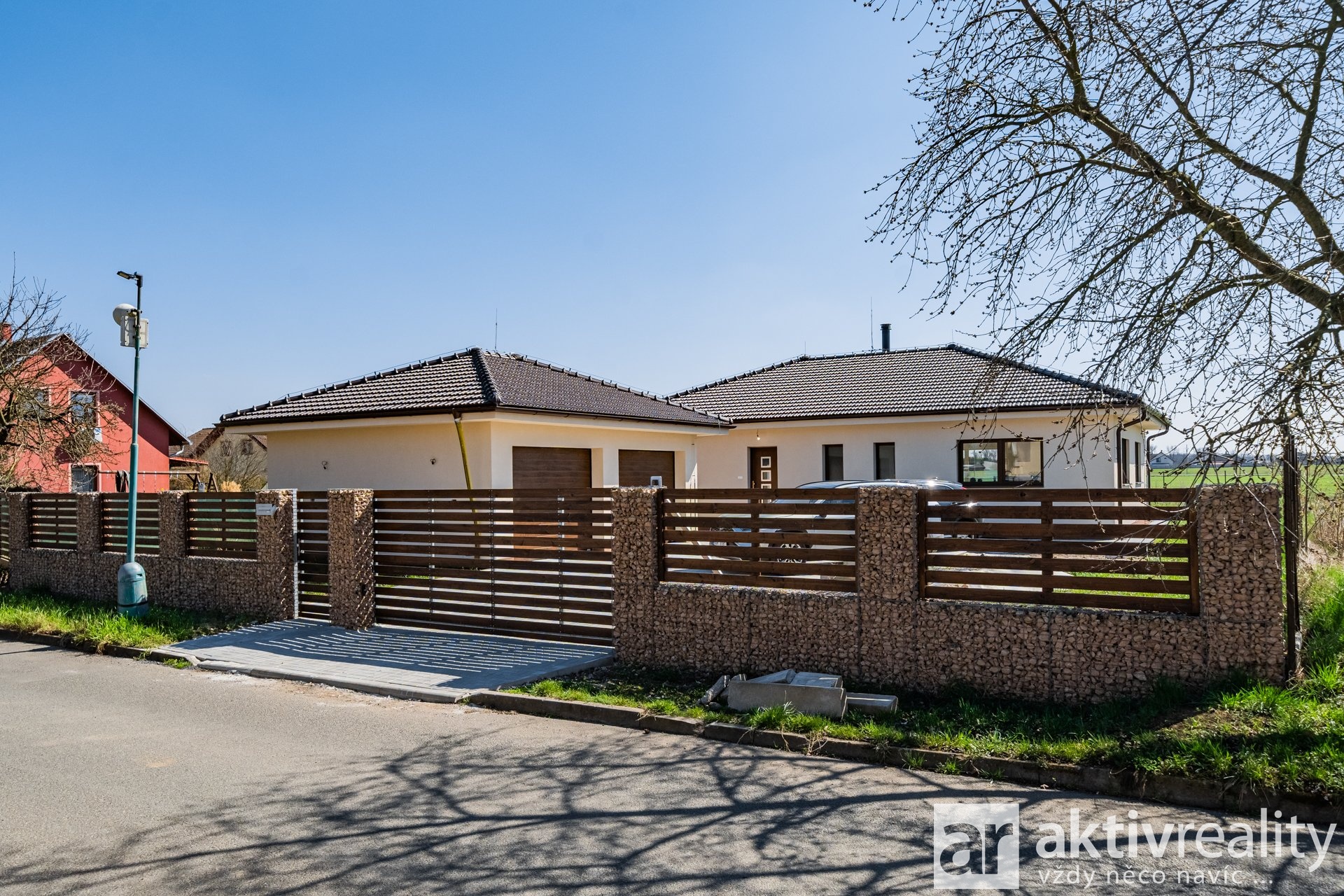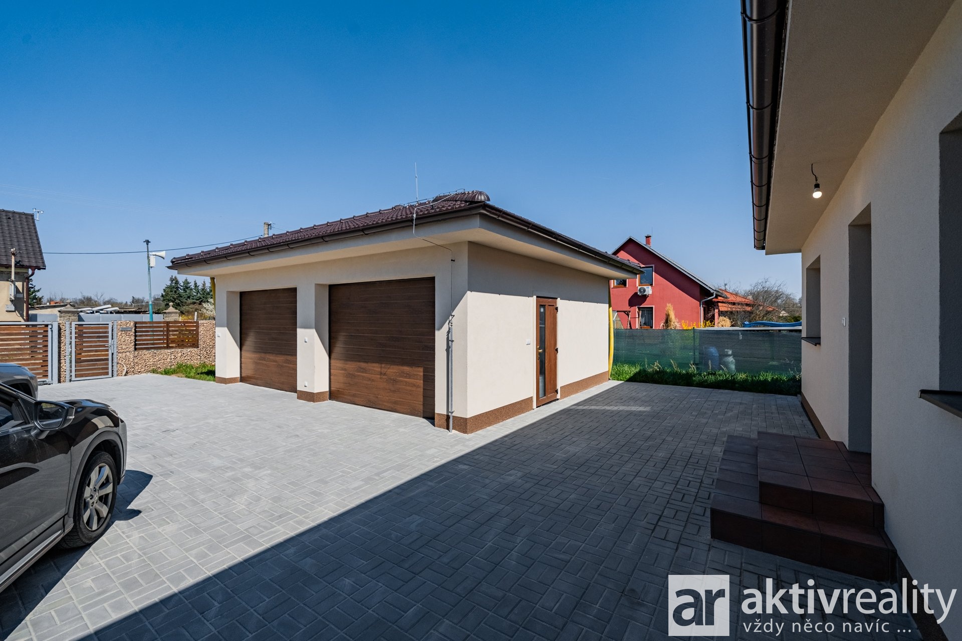 Pronájem moderní novostavby přízemního bungalovu o dispozici 5+kk s užitnou plochou 156 m2, nacházející se v klidné obci Hořín, jen 2 km od Mělníka a zhruba 30 minut jízdy od Prahy. Součástí je prostorná samostatná dvougaráž o velikosti 45 m2 s toaletou a automatickými vraty, která poskytuje pohodlné parkování i dostatek úložného prostoru. Centrálním místem domu je světlý obývací pokoj propojený s moderní kuchyní a jídelnou (dohromady téměř 60 m2), odkud vedou velká posuvná okna přímo na terasu o ploše 48 m2. V kuchyni nechybí ostrůvek a praktická spíž. V obytné části se dále nachází ložnice se šatnou a vlastní koupelnou, dva dětské pokoje se společnou koupelnou a samostatnou toaletou, pracovna, technická místnost a prostorná vstupní chodba s vestavěnými skříněmi. Dům je vybaven moderními technologiemi, včetně tepelného čerpadla vzduch–voda, podlahového vytápění s individuálním ovládáním v každé místnosti, trojskel a venkovních žaluzií, které lze ovládat i na dálku pomocí mobilní aplikace. Velkou výhodou je i systém pro zachycování dešťové vody a kvalitní zateplení, které zajišťuje nízké provozní náklady. Přímo v obci je částečná občanská vybavenost, například mateřská škola a obchod. V sousedním Mělníku je kompletní občanská vybavenost. Volně stojící nábytek není součástí pronájmu.