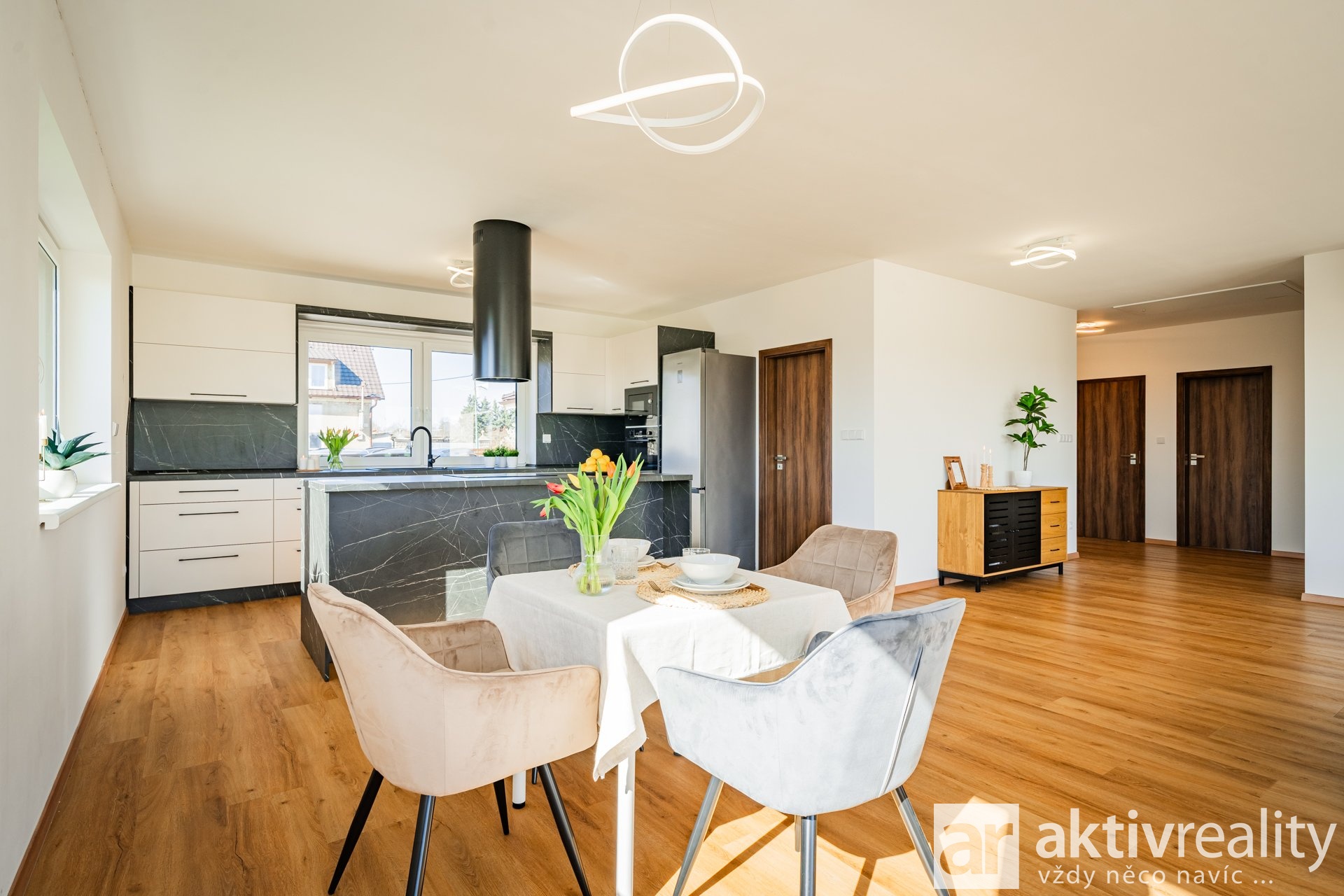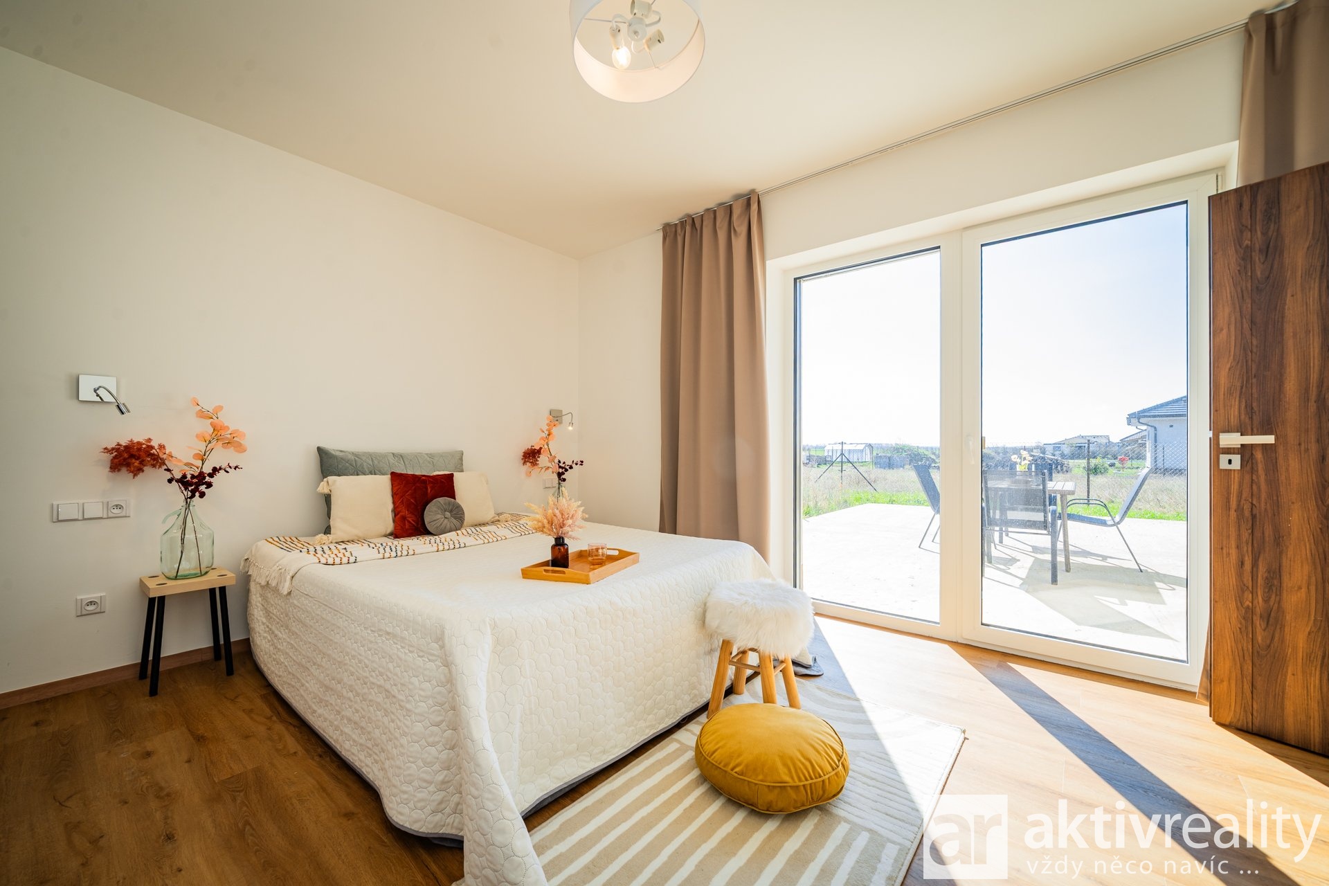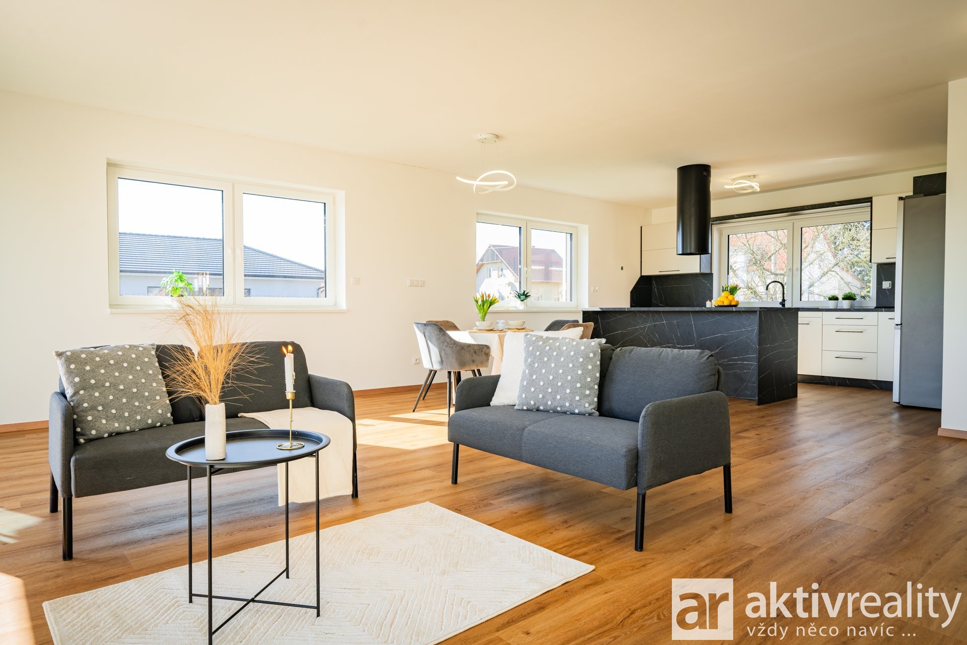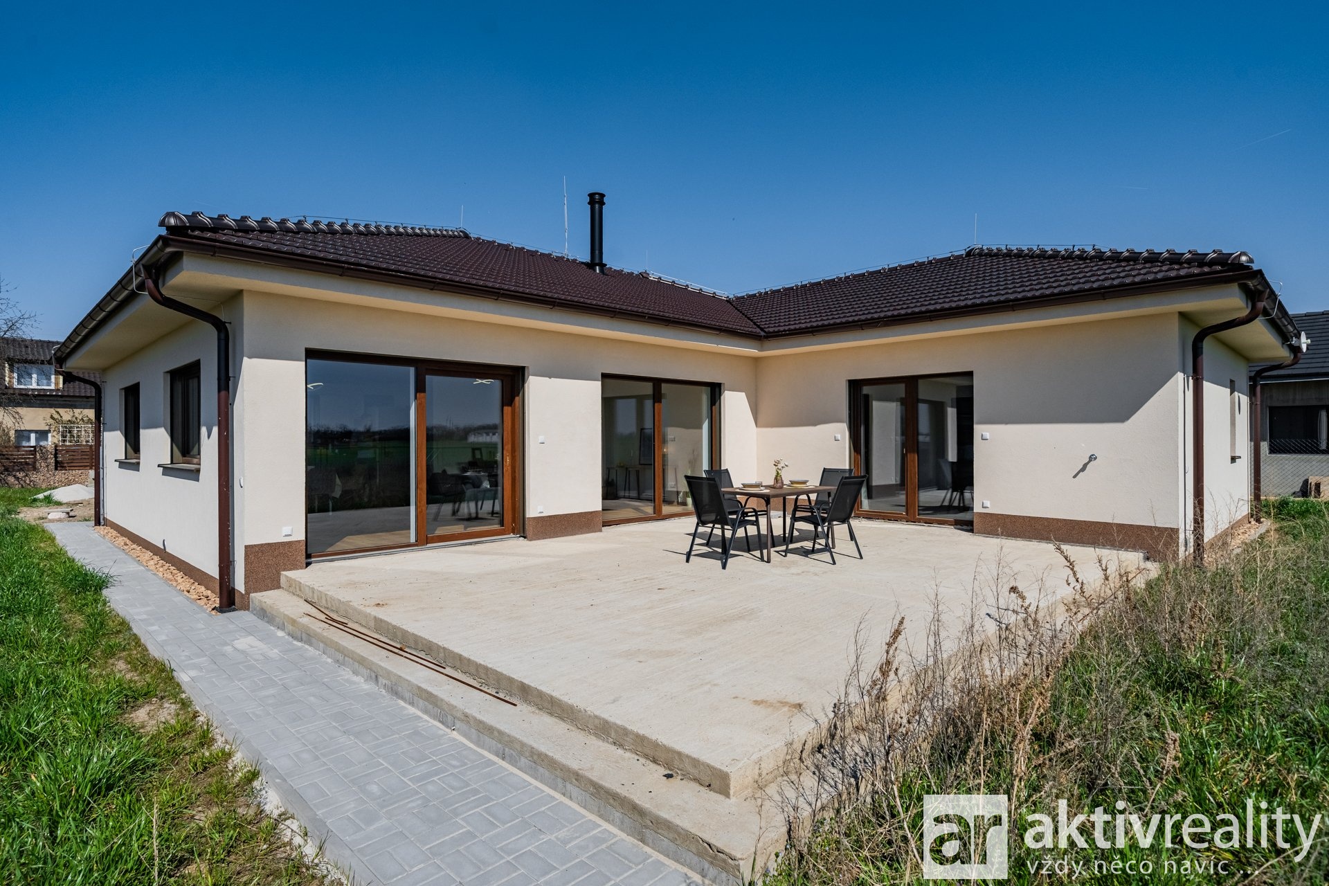 Pronájem moderní novostavby přízemního bungalovu o dispozici 5+kk s užitnou plochou 156 m2, nacházející se v klidné obci Hořín, jen 2 km od Mělníka a zhruba 30 minut jízdy od Prahy. Součástí je prostorná samostatná dvougaráž o velikosti 45 m2 s toaletou a automatickými vraty, která poskytuje pohodlné parkování i dostatek úložného prostoru. Centrálním místem domu je světlý obývací pokoj propojený s moderní kuchyní a jídelnou (dohromady téměř 60 m2), odkud vedou velká posuvná okna přímo na terasu o ploše 48 m2. V kuchyni nechybí ostrůvek a praktická spíž. V obytné části se dále nachází ložnice se šatnou a vlastní koupelnou, dva dětské pokoje se společnou koupelnou a samostatnou toaletou, pracovna, technická místnost a prostorná vstupní chodba s vestavěnými skříněmi. Dům je vybaven moderními technologiemi, včetně tepelného čerpadla vzduch–voda, podlahového vytápění s individuálním ovládáním v každé místnosti, trojskel a venkovních žaluzií, které lze ovládat i na dálku pomocí mobilní aplikace. Velkou výhodou je i systém pro zachycování dešťové vody a kvalitní zateplení, které zajišťuje nízké provozní náklady. Přímo v obci je částečná občanská vybavenost, například mateřská škola a obchod. V sousedním Mělníku je kompletní občanská vybavenost. Volně stojící nábytek není součástí pronájmu.