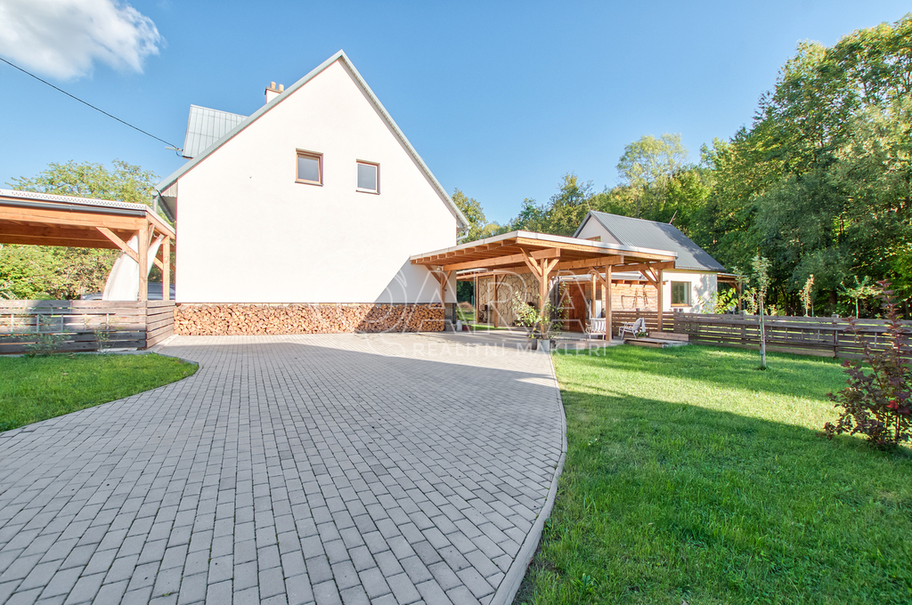 Exteriér: Zahrada s krásnou pergolou a výhledem do lesa je stvořena pro odpočinek. Parkování pro čtyři auta je zajištěno. Velký bonus: Pozemek o rozloze 1280 m² umožňuje jeho zastavitelnost pro budoucí rozšíření domu o další pokoje!