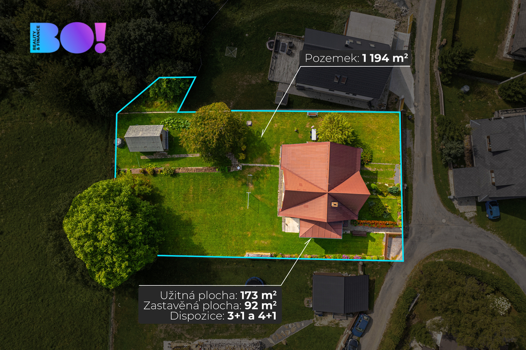 Užitná plocha domu je cca 173 m², zastavěná plocha 92 m².