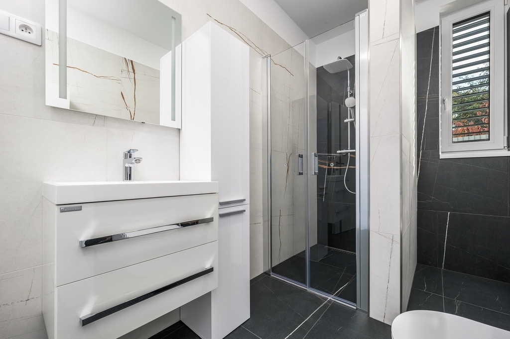 Energetika: vlastní tepelné čerpadlo a vodoměr pro každou jednotku, instalovaný fotovoltaický systém se solárními panely na střeše, podlahové vytápění v celém domě