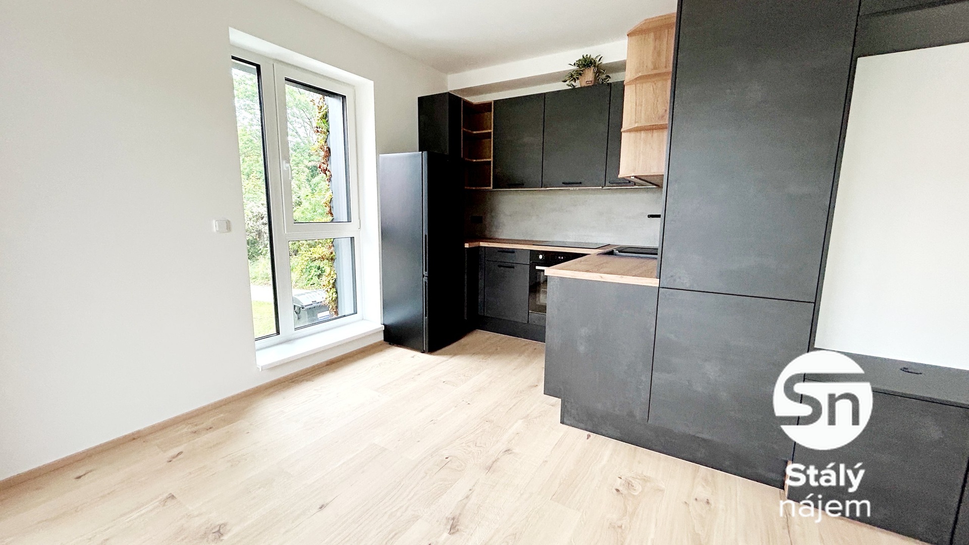 Součástí vybavení je nová kuchyňská linka, která elegantně doplňuje hlavní obytný prostor. Z oken je příjemný výhled do klidné ulice s okolní zástavbou.