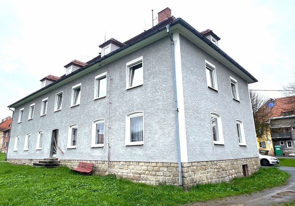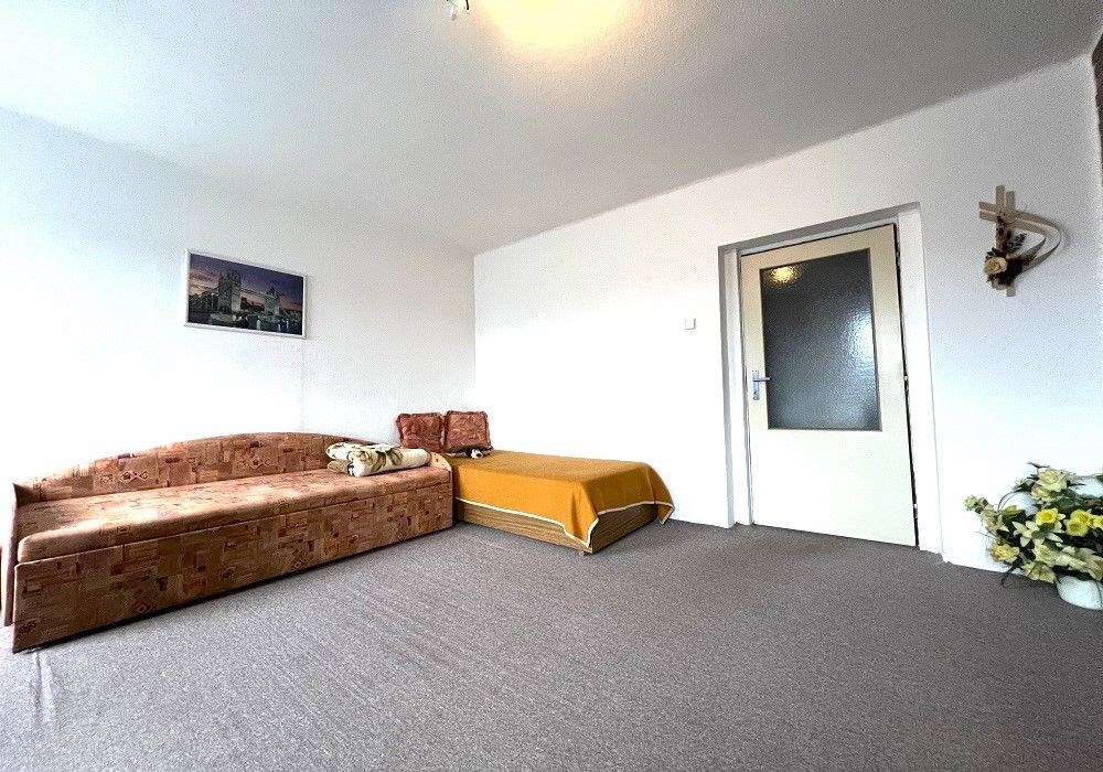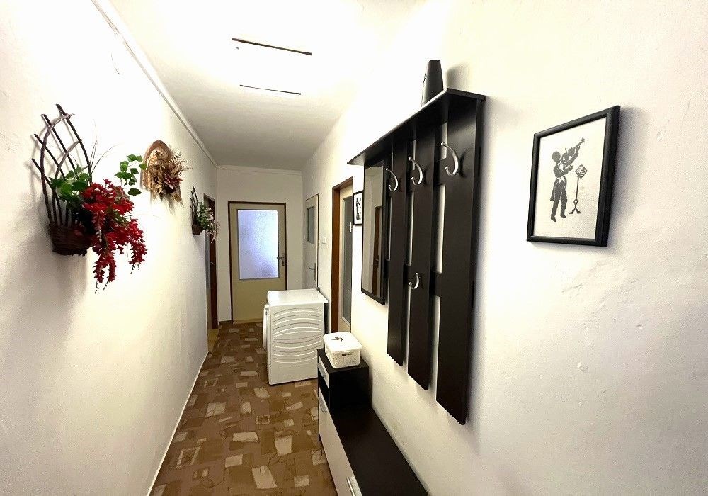 Podlažní byt o dispozici 3+1 (3x místnost + kuchyně) s příslušenstvím a kompletním provozním vybavením o celkové výměře užitné plochy 90 m2 s obytnou plochou 74 m2, vlastními nebytovými prostorami (půda cca 35 m2, 2x sklep 16 m2) a společnými prostorami. Bytové prostory jsou situovány ve II. nadzemním podlaží (1. patro) částečně modernizovaného činžovního domu zděné konstrukce s celkem čtyřmi byty, nebytovými prostorami (sklepy, půdy) a společnými prostorami. Byt je v dobrém technickém stavu po provedení částečné modernizace (výměna oken za plastová s izol. skly s venkovními roletami, renovace podlah a dveří, rekonstrukce koupelny, výměna instalací, modernizace plynového vytápění…) s možností okamžitého užívání a bydlení, či provedení rekonstrukce prostor dle představ nového vlastníka, bez jakýchkoli omezení vlastnických práv k dispozici od termínu 12/2025 (v případě zachování stávajícího pronájmu lze převod nemovitosti realizovat ihned). Orientace oken v bytu na východ, jih a západ s výhledem do veřejné zeleně a okolní městské zástavby. Bytový dům je dvoupodlažní, podsklepený objekt bez výtahu, situován v klidné lokalitě navazující na okolní bytové domy, garáže a zahrady. Třída ENB:G průkaz nezpracován. Možnost parkování os. automobilu na veřejném prostranství ihned u bytového domu. Byt je vhodný a využitelný k trvalému rodinnému bydlení v klidné lokalitě v malém historickém městě Horšovský Týn s kompletní vybaveností, dostupností služeb a dopravní infrastrukturou, cca 10 km od okresního města Domažlice. Předností nabízených bytových prostor je dispozice a velikost obytné plochy bytu, kompletní provozní vybavení a technický stav bytu, existence půdních a 2x sklepních prostor s větší užitnou skladovací plochou. Dispozice bytu: Vstup, chodba, kuchyně s jídelnou, obytná místnost, 2x ložnice, WC, koupelna (sprchový kout, umyvadlo), technický prostor, krytý balkón. Vybavení bytu: kuchyňská linka, sporák, částečně nábytek, komplet. zařizovací předměty, osvětlovací tělesa, koupelnové a provozní vybavení, rozvody TV , tel. + internet. Topení: etážové plynové (vlastní kotel pouze pro byt). Podlahová plocha bytu: 74 m2. Celková užitná plocha bytu s příslušenstvím: 90 m2