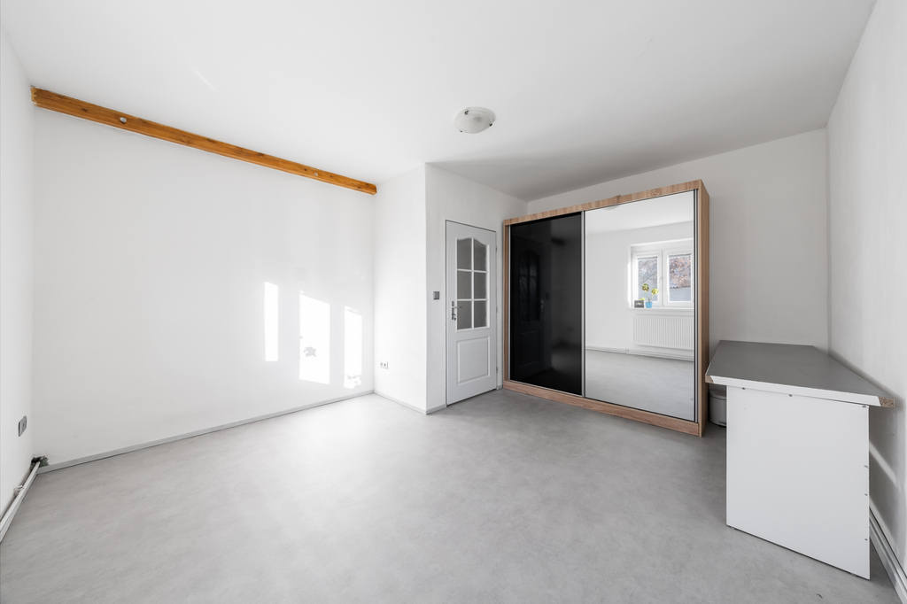Rodinný dům je zděné konstrukce, částečně podsklepený, s jedním nadzemním podlažím a podkrovím. Dispozice zahrnuje obývací pokoj, kuchyň, ložnici, dva dětské pokoje, koupelnu s toaletou, dvě komory, místnost připravenou pro vybudování druhé koupelny a vstupní zádveří se schodištěm do podkroví i sklepa. Podkroví tvoří volný půdní prostor, který představuje zajímavý potenciál pro rozšíření obytné plochy.