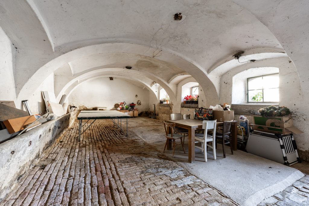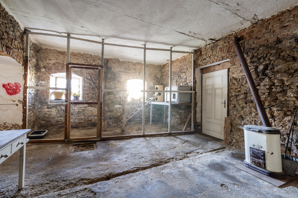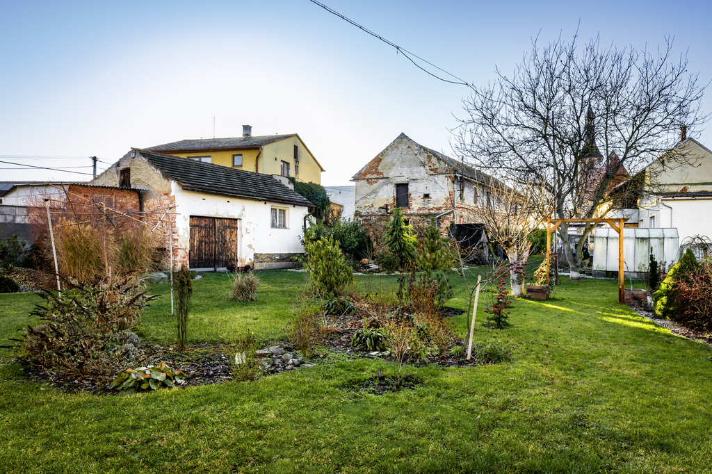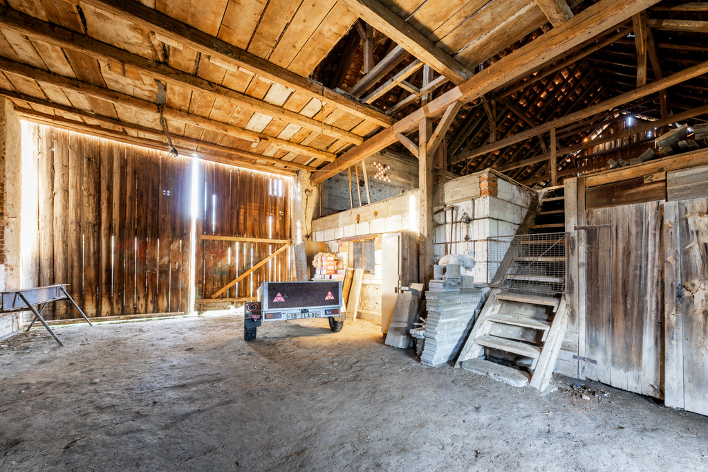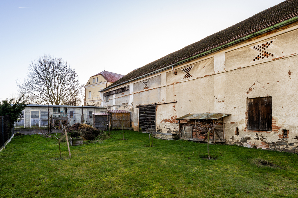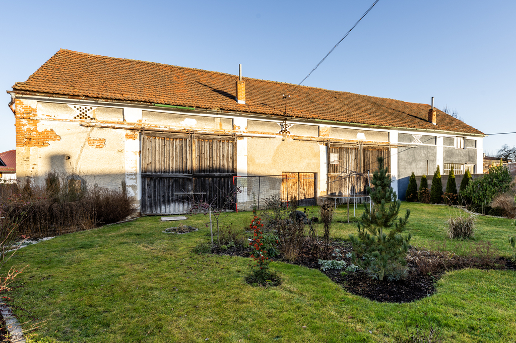 Naproti rodinnému domu se nachází stavba bývalého chléva s jedním nadzemním podlažím a podkrovím. Objekt je v dobrém stavu, průběžně udržovaný a aktuálně slouží jako sklad a zázemí pro zvířata. V zadní části pozemku stojí stodola, jejíž součástí je vestavěná garáž a několik menších skladových prostor. Předmětem prodeje jsou však pouze dvě třetiny této stavby, jelikož část přesahující na sousední pozemek je ve vlastnictví souseda. Stodola je vnitřně rozdělena příčkou a zároveň slouží jako průchod na zbývající část zahrady. Součástí prodeje je dále také garáž, umístěná uprostřed zahrady na hranici pozemku.