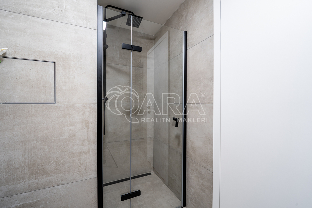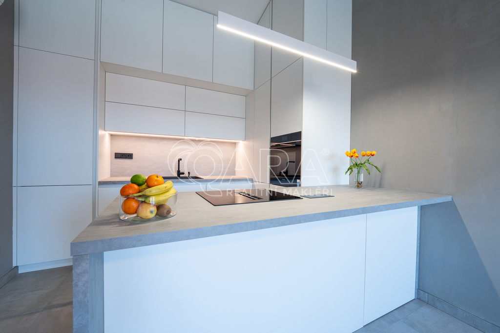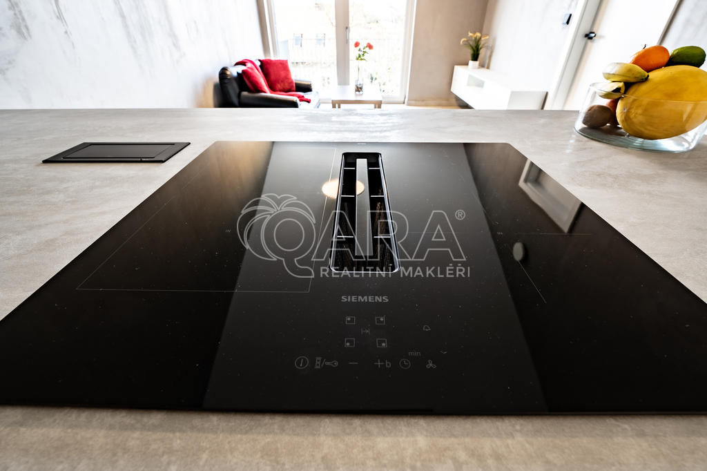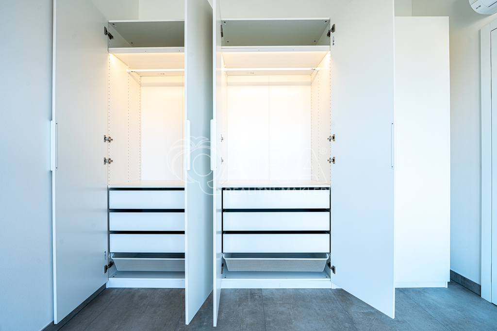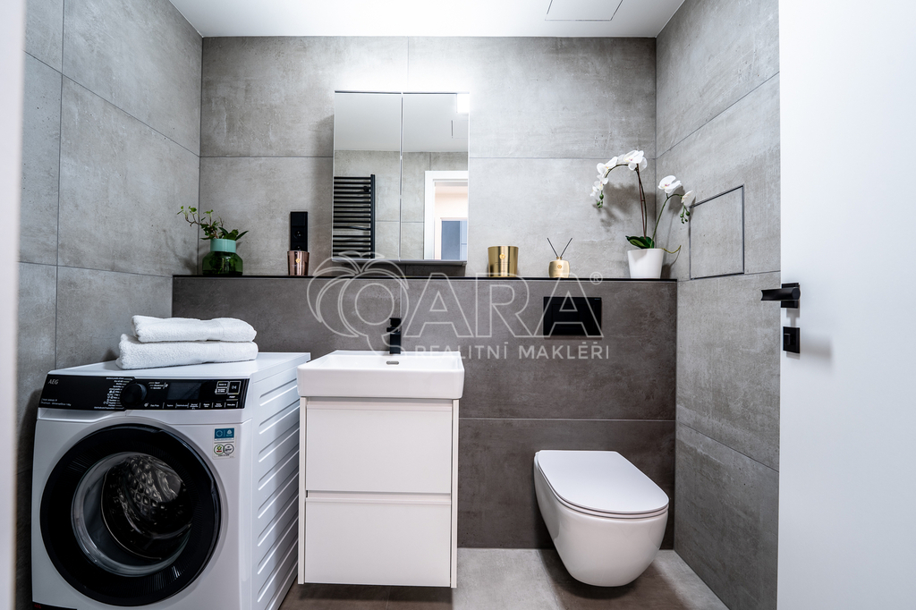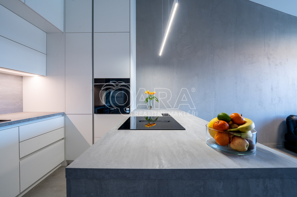 Byt o dispozici 2+kk disponuje designovou kuchyní se spotřebiči Siemens. Patří mezi ně také varná deska s integrovaným odsavačem par. Skřínky na míru vám nabídnou mnoho úložného prostoru - sahají až po strop. Koupelna se sprchovým koutem je vybavena pračkou AEG. Ve druhém pokoji, který vám může sloužit jako ložnice, jsou připraveny skříně s vnitřním osvětlením. K vašemu komfortnímu bydlení přispěje podlahové topení pod velkoplošnou dlažbou, v létě předokenní elektrické žaluzie a klimatizace v obou pokojích.