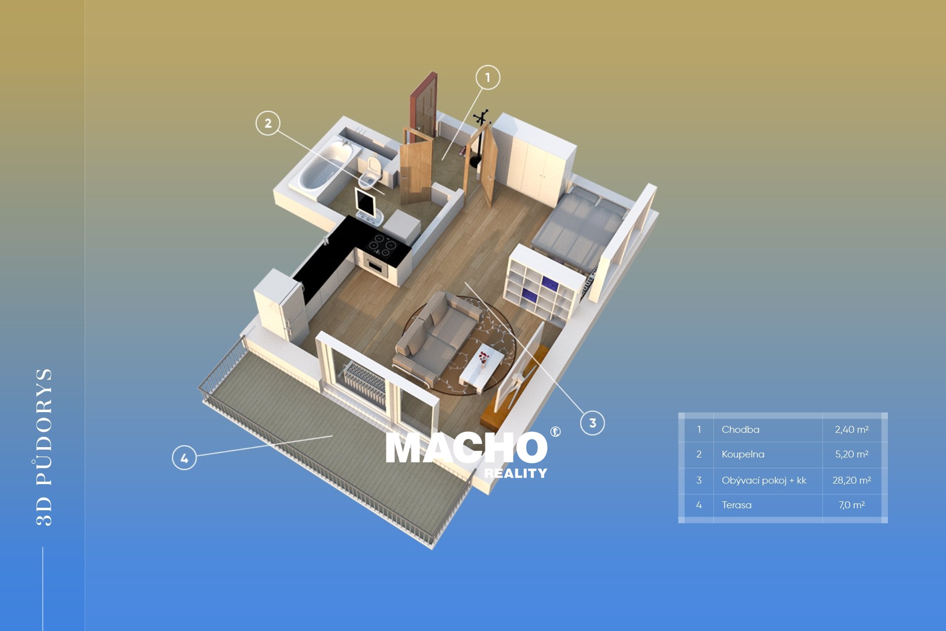 Byt o celkové ploše 36 m² se nachází v 5. nadzemním podlaží cihlového domu. Součástí bytu je také prostorná terasa o velikosti 7 m², která nabízí příjemné místo k relaxaci.