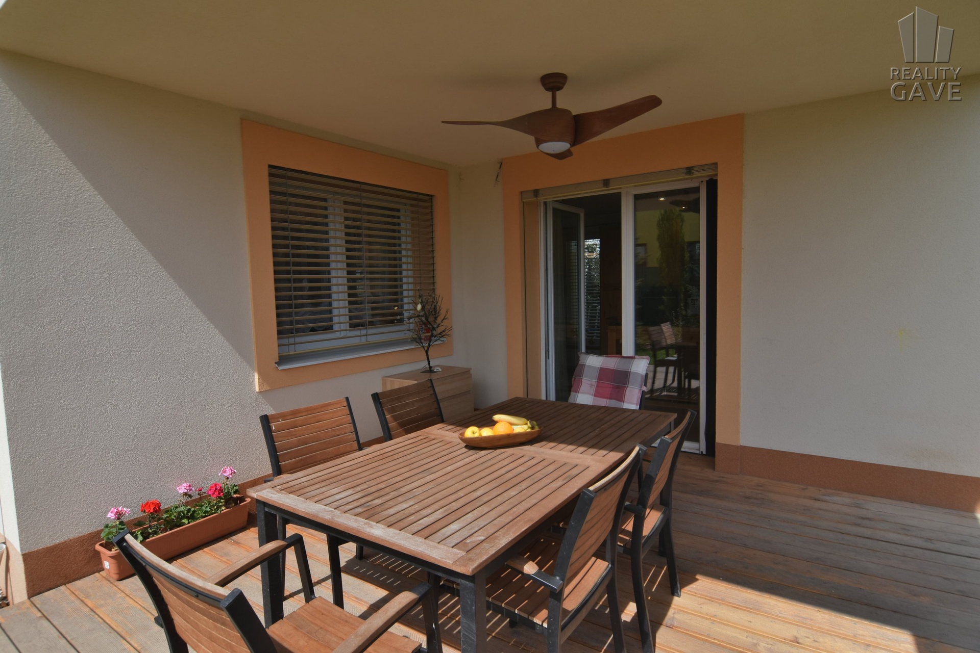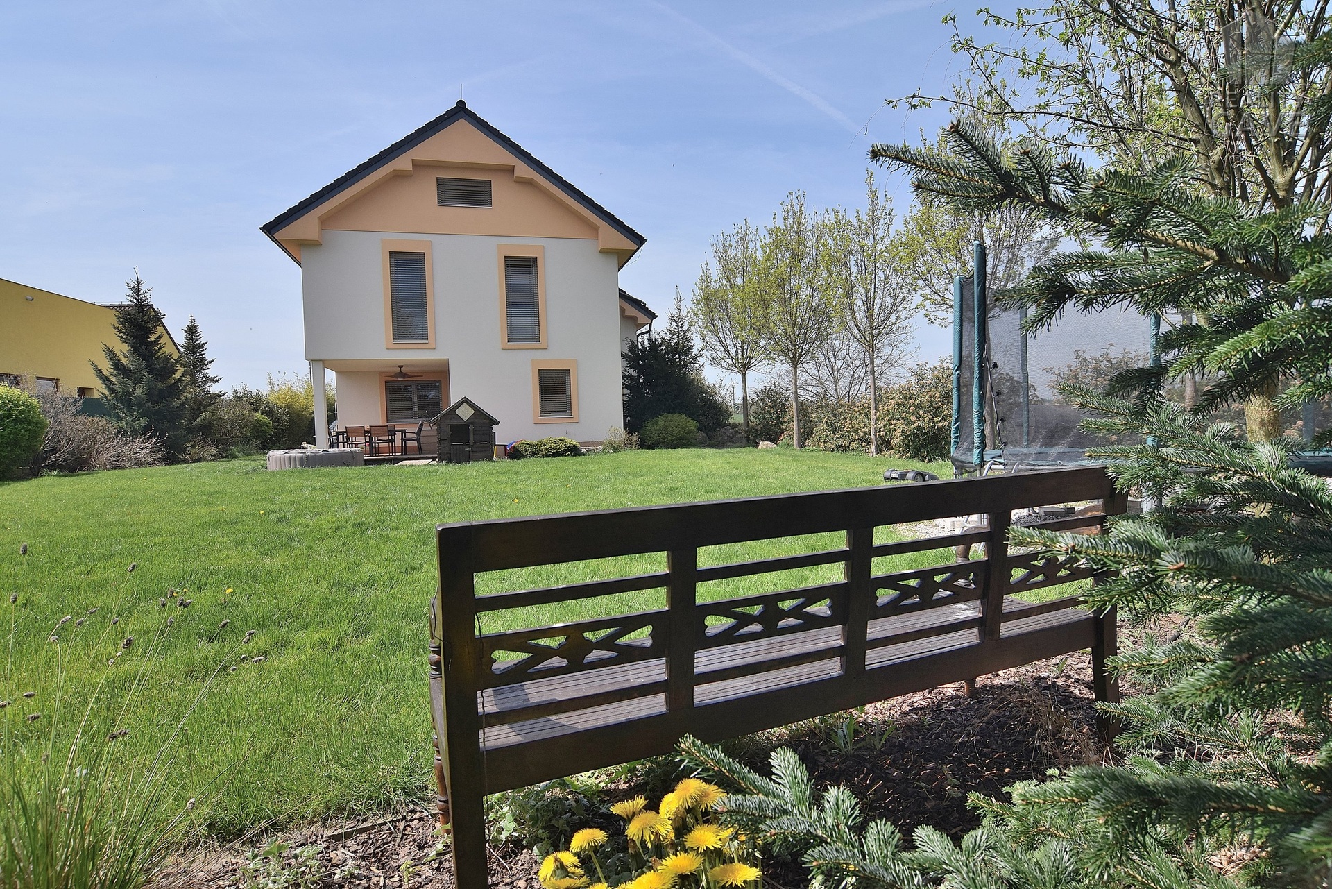 Zahradní úpravy byly zpracovány a realizovány zahradním architektem. Z kuchyně je přímý vstup na krytou terasu pod konstrukcí horního patra s posezením a výhledem do udržované zahrady.