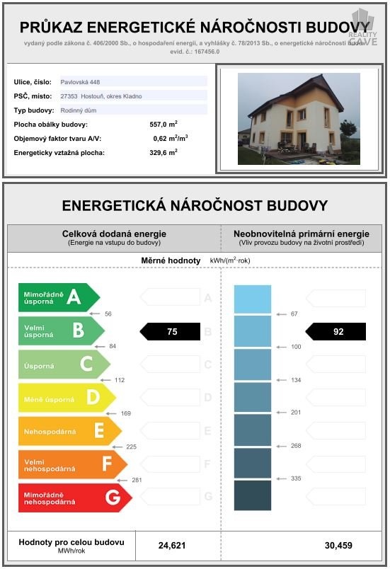 Ukazatel energetické náročnosti budovy:75 kWh/m²