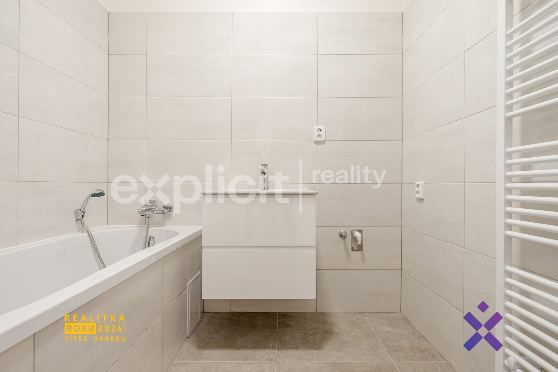 Součástí bytu je také samostatná toaleta a zděná koupelna s vanou. Nechybí ani dostatek prostoru pro pračku a sušičku.