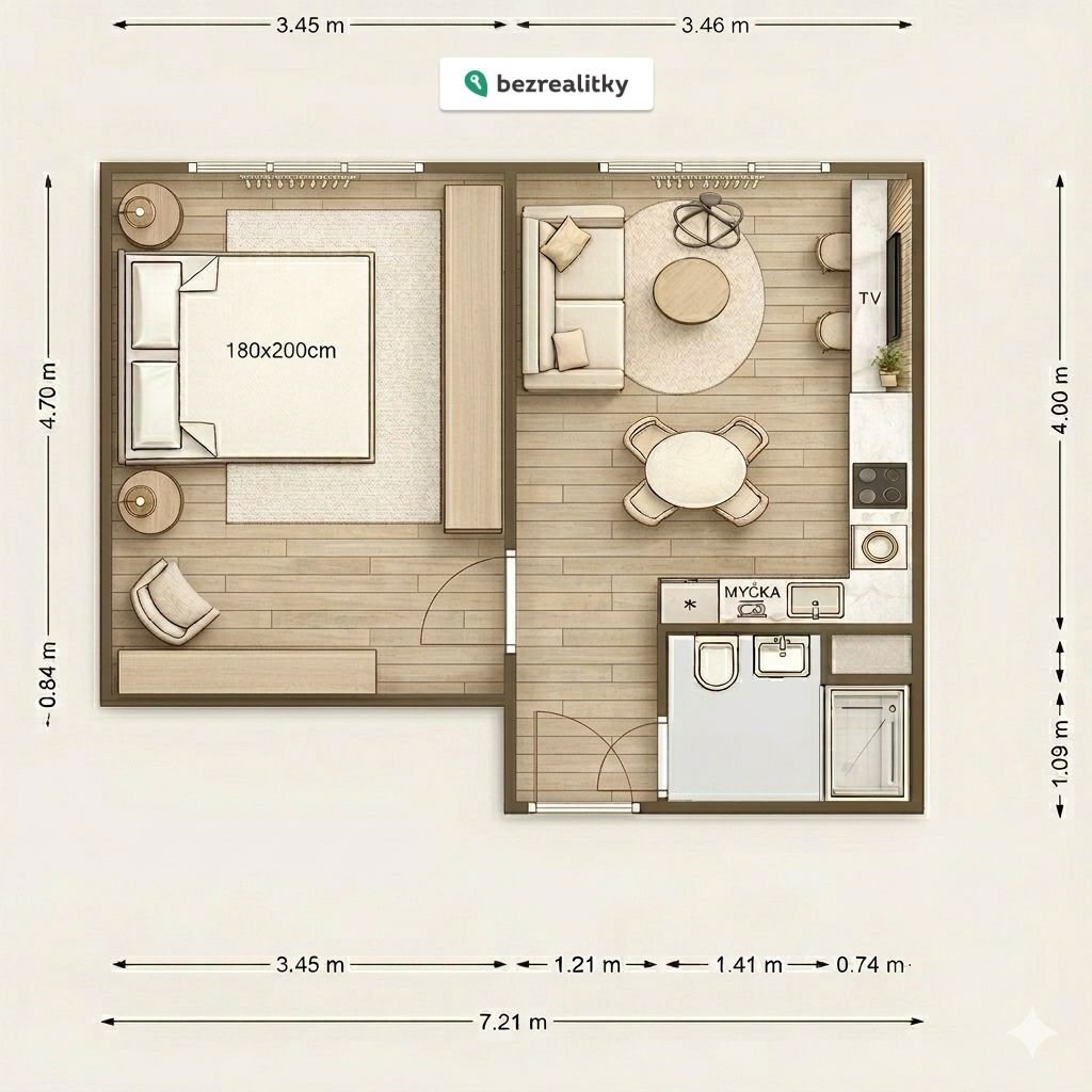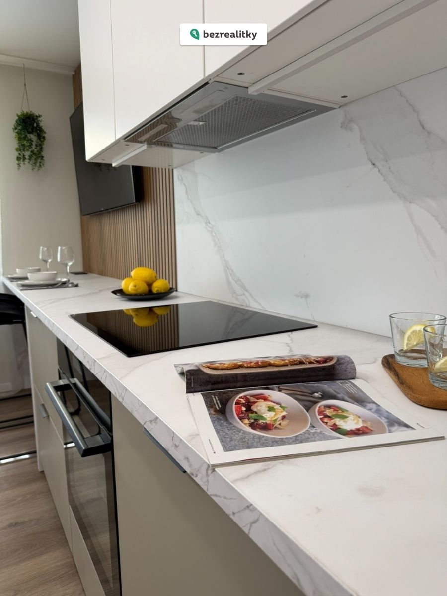 • Obývací pokoj s Kuchyní, co vaří skoro sama: Myčka, pračka, indukce, trouba i mikrovlnka. A k tomu TV, abyste u míchání omáčky věděli, co je nového.
