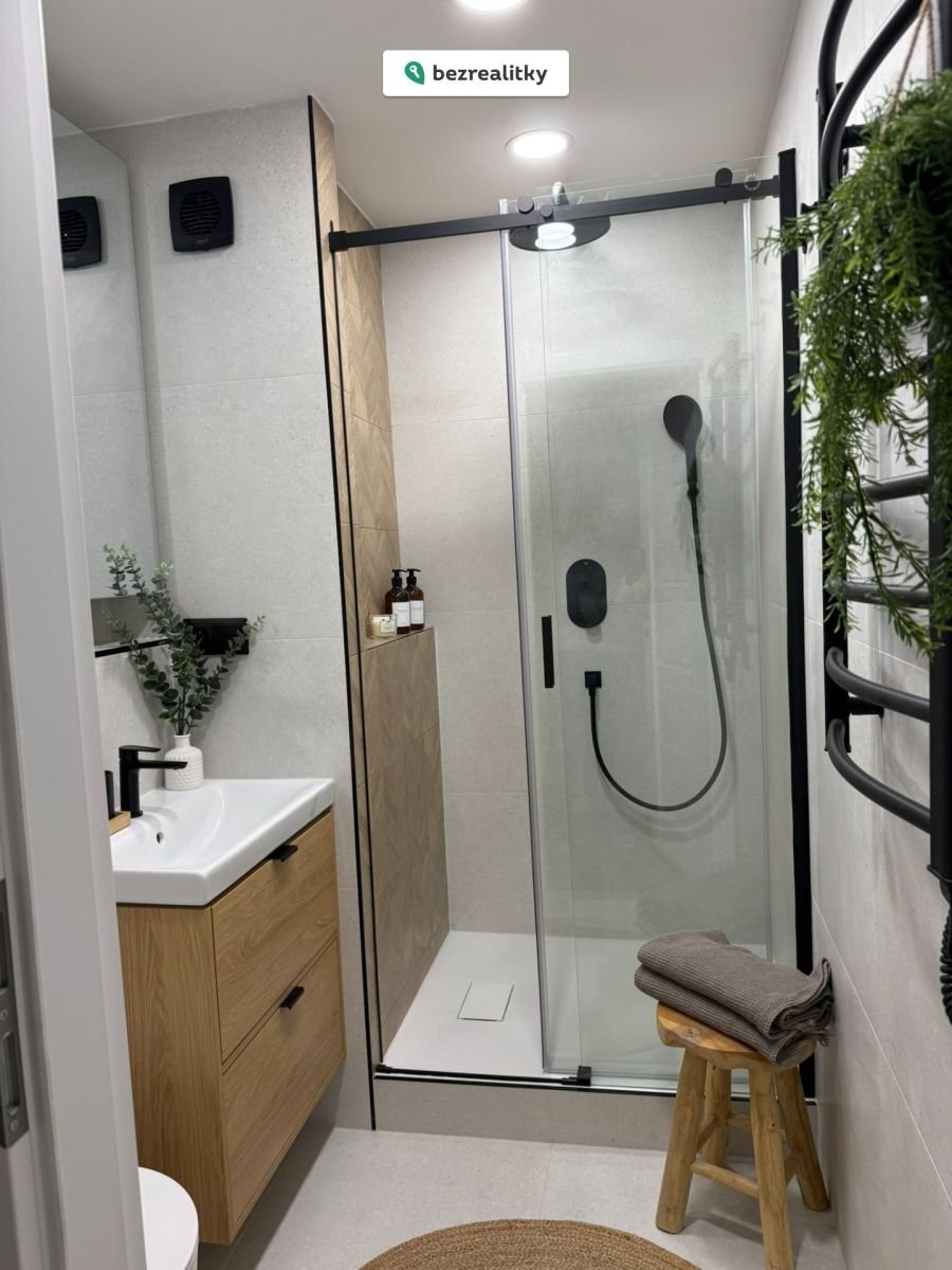 • Koupelna, kde nic nechybí: Sprchový kout, WC i praktická umyvadlová skříňka. Parní sauna a vířivka už se nám tam sice (těsně!) nevešly, ale ranní osvěžení zvládnete s grácií i bez nich.