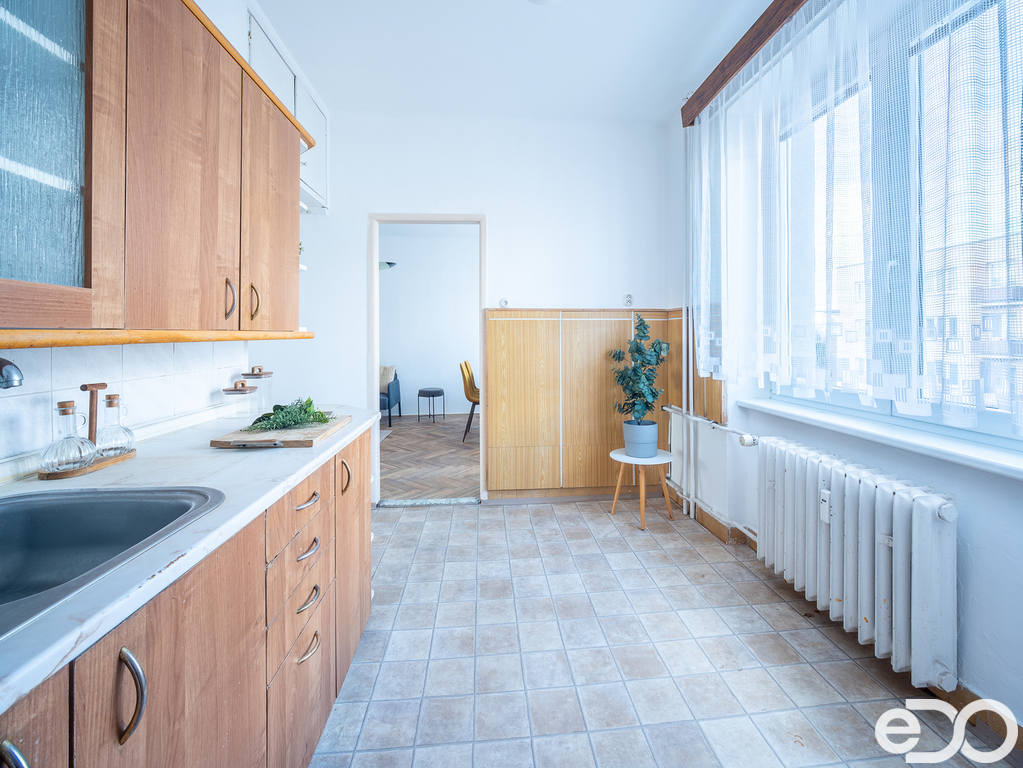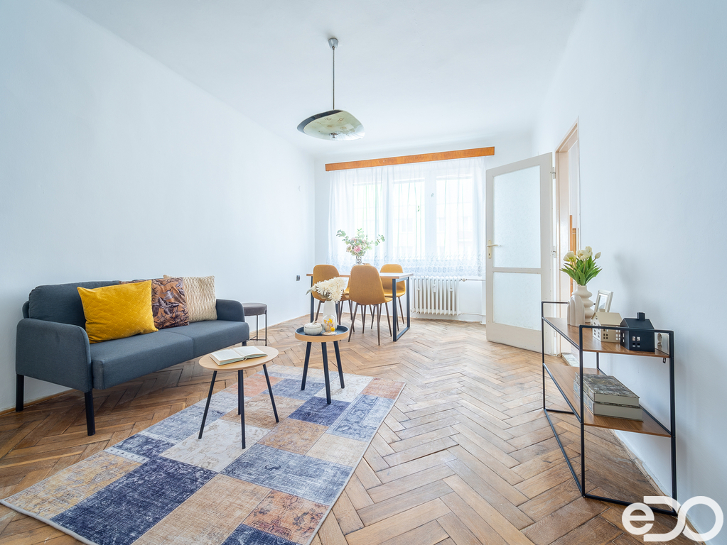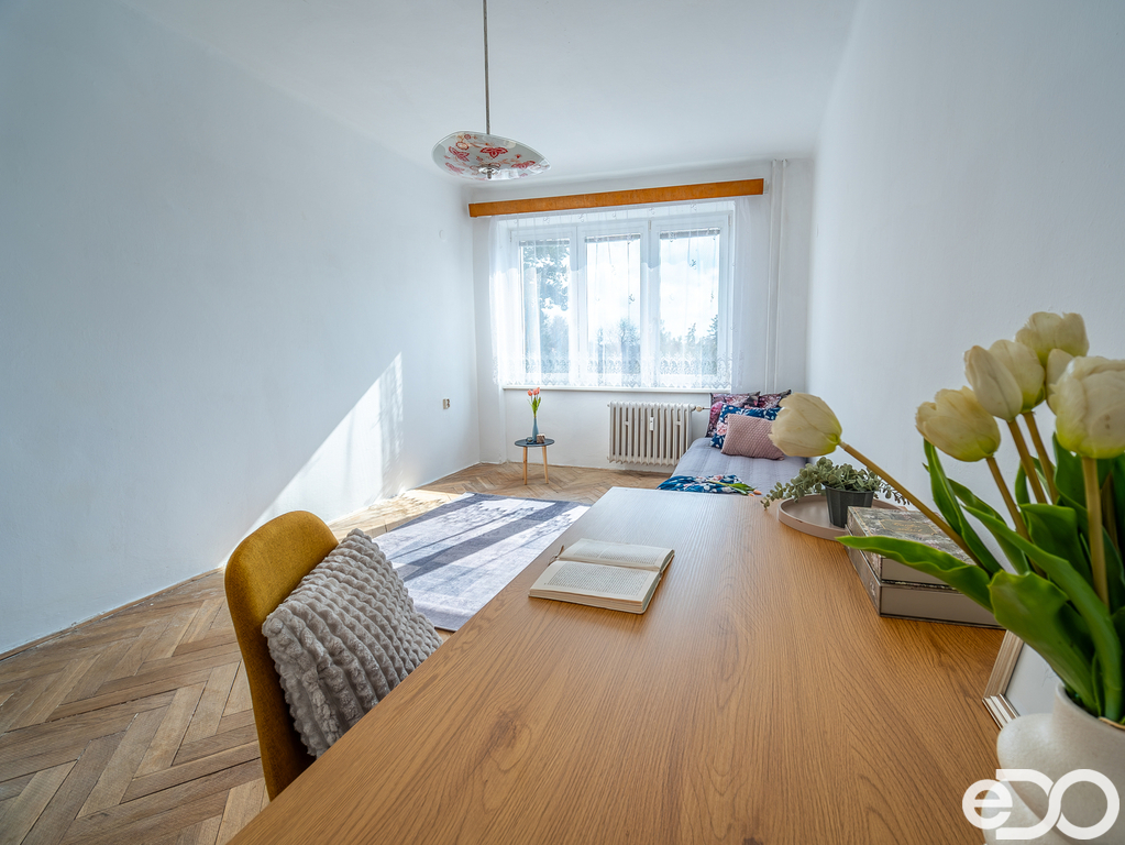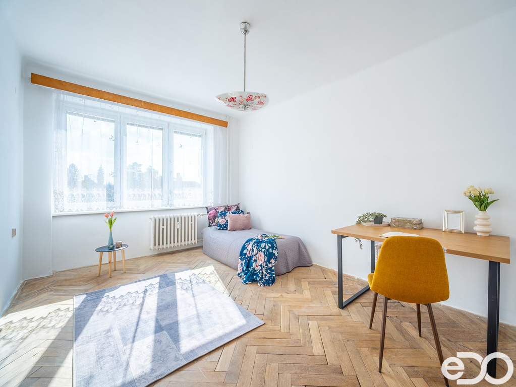 Dispozice bytu nabízí dostatek prostoru pro obývací pokoj, ložnici a dětský pokoj, případně pracovnu. Velká okna zajišťují příjemné prosvětlení jednotlivých místností a byt působí vzdušným dojmem. Byt je v původním stavu, což umožňuje novým majitelům upravit si interiér přesně podle svých potřeb bez kompromisů.
