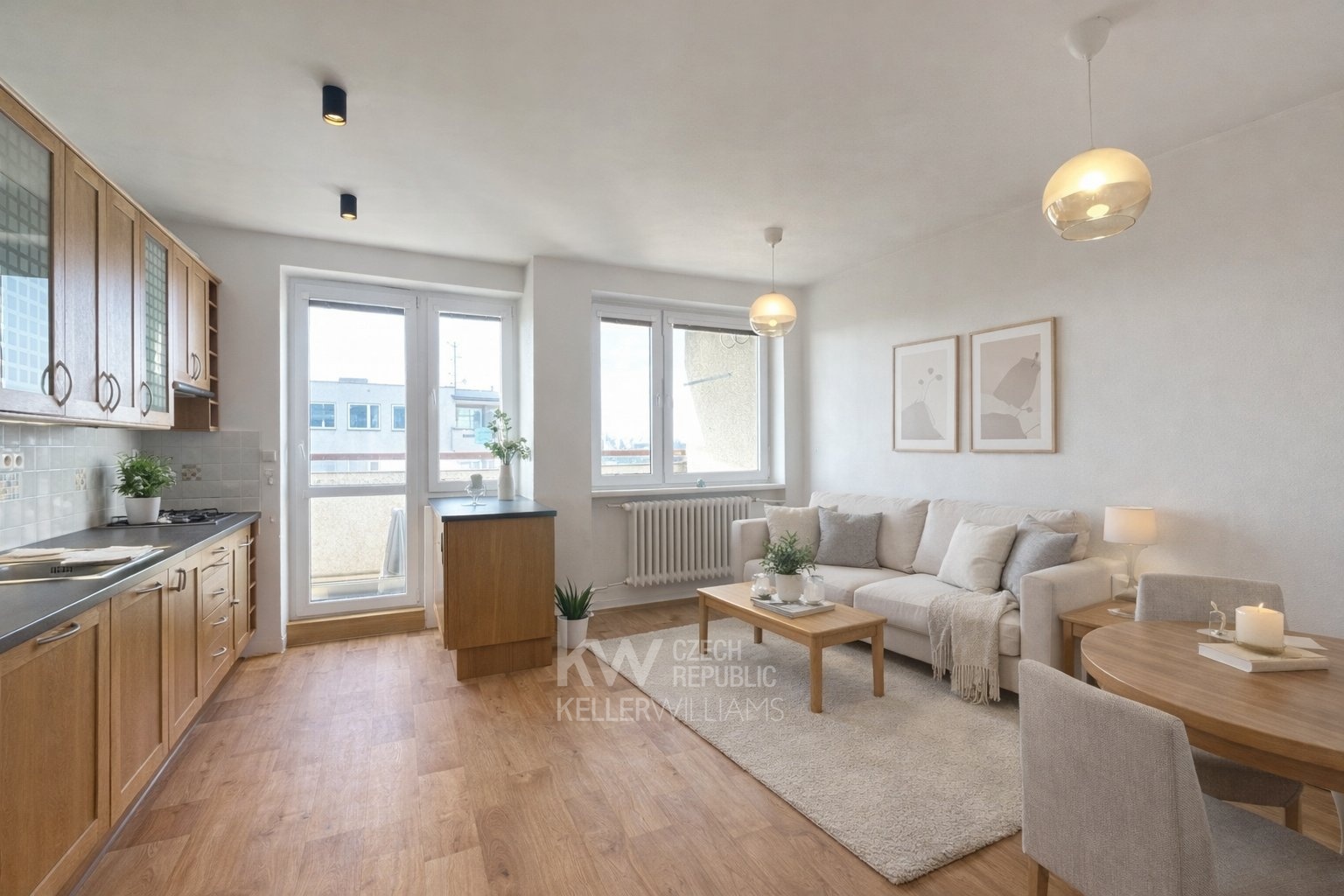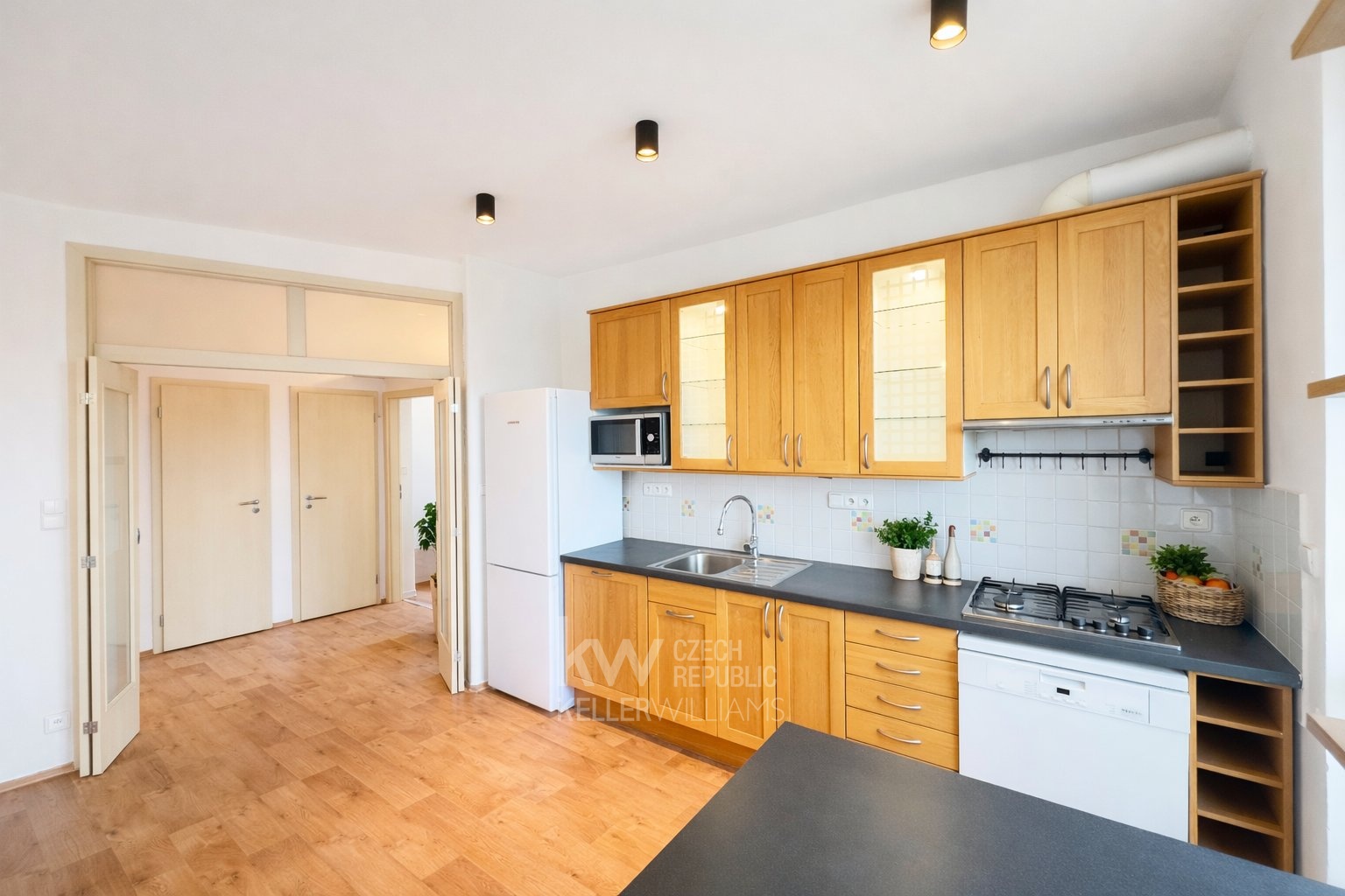 Obývací pokoj s přímým vstupem na balkon, nabízející dostatek prostoru pro relaxaci i společenské setkávání. Na obývací pokoj navazuje kuchyňský kout s moderní linkou s dvířky ze světlého dubového masivu, vybavenou vestavěnými spotřebiči včetně sporáku, myčky a lednice. Promyšlené uspořádání a dostatek úložných prostor zajišťují maximální praktičnost.
