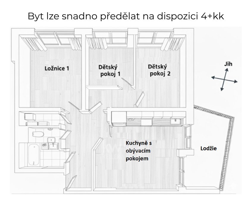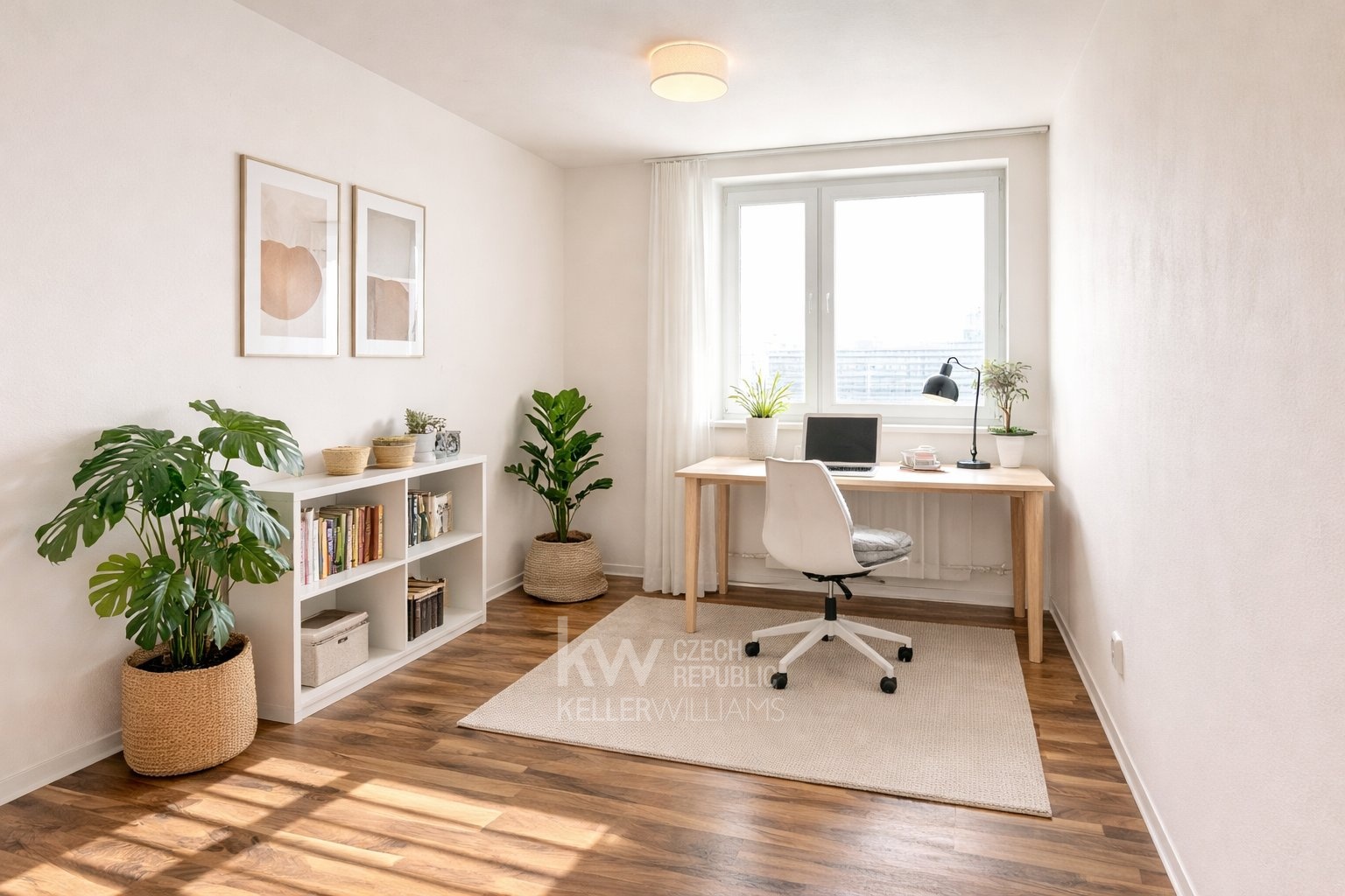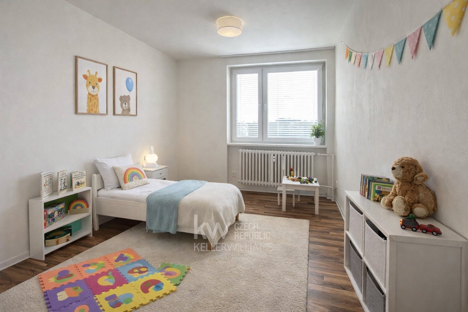Ložnice a Dětský Pokoj: Byt disponuje dvěma samostatnými pokoji, které lze využít jako ložnice, dětský pokoj nebo pracovnu. Oba pokoje jsou světlé a nabízejí klidné zázemí pro odpočinek či práci.