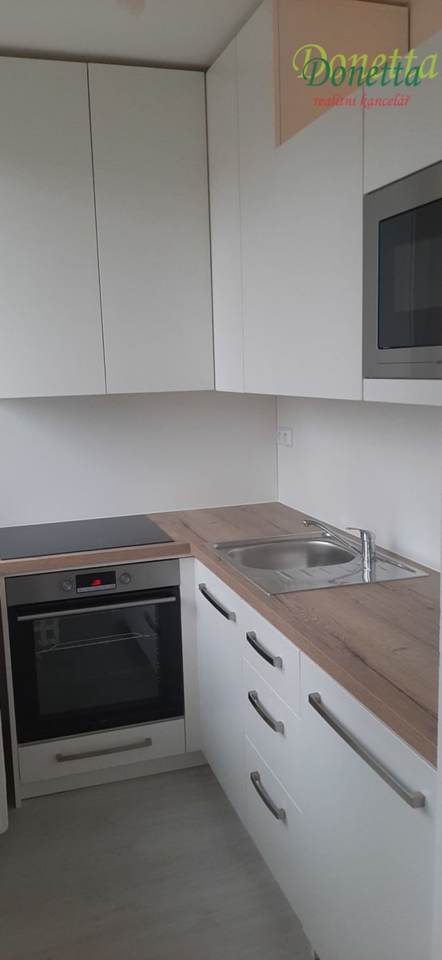Dispozice bytu: vstupní chodba s úložnou skříní, koupelna se sprchou, umyvadlem, místem pro pračku a toaletou, obytný pokoj, ze kterého je vstup na balkón a oddělený kuchyňský kout se zcela novou kuchyňskou linkou se spotřebiči (lednice, mikrovlnná trouba, dřez, sporák, elektrická trouba).