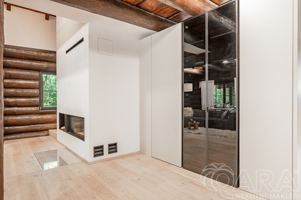 • Obývací část s velkým zaskleným krbem a sedací soupravou na míru