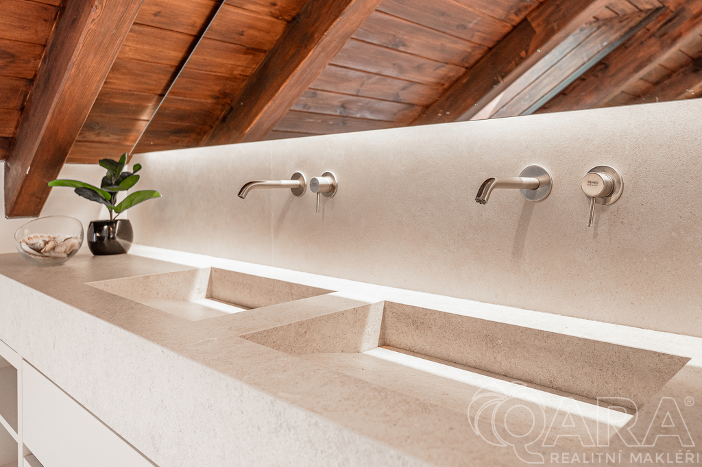 • Hlavní obytný prostor (64 m²) – kuchyňská část s velkým ostrůvkem, kvalitními vestavnými spotřebiči a filtračním systémem na pitnou vodu