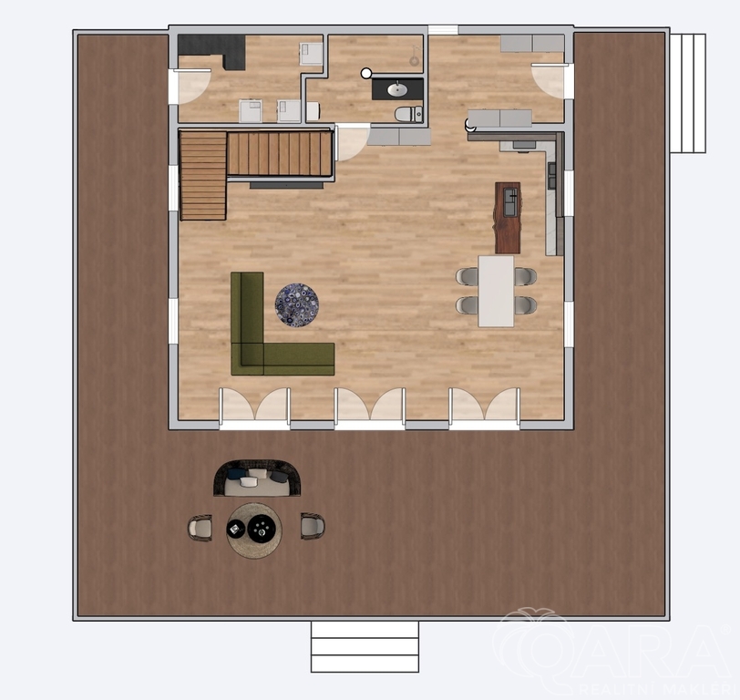 • Přímý vstup na terasu o velikosti 100 m² z evropského modřínu, s přípravou pro venkovní kuchyň