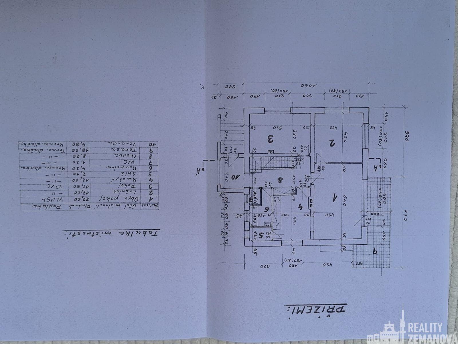 Přízemí: vstupní veranda, prostorná hala, samostatné WC, koupelna, dětský pokoj, ložnice, kuchyně, světlý obývací pokoj s přímým vstupem na terasu a na zahradu.