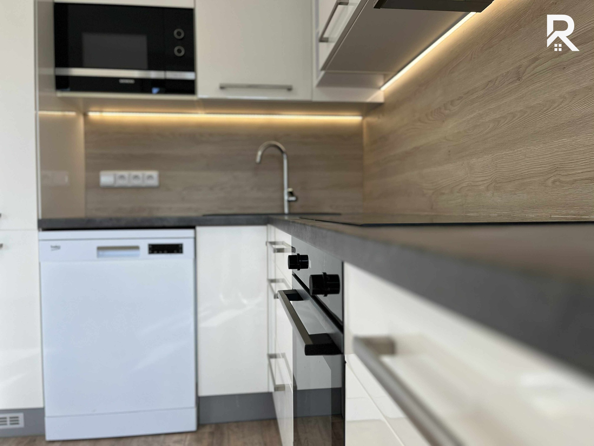 Dominantou bytu je světlý obývací prostor s kuchyňským koutem na míru, který je plně vybaven – lednice s mrazákem, myčka, trouba, všechno připraveno k používání. Z obýváku se dostanete na balkon s výhledem do zahrady a na vinice, ideální místo pro ranní kávu nebo večerní relax.