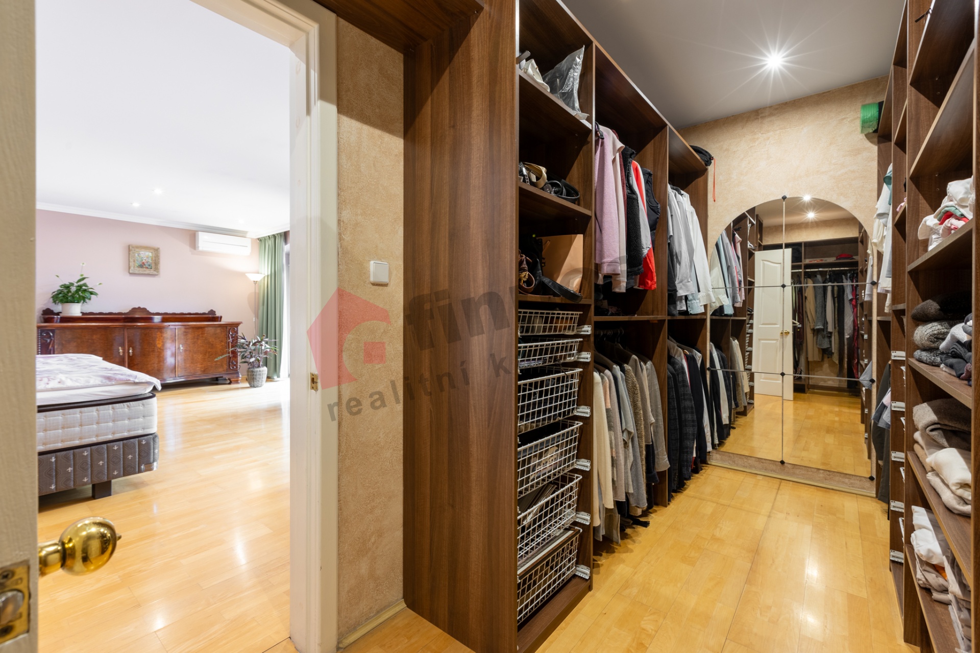 V patře se nachází velký a světlý obývací pokoj propojený s moderní kuchyní, která je plně vybavena spotřebiči. Moderní koupelna je vybavena kvalitními materiály a oddělenou toaletou. Dvě komory poskytují dostatek prostoru pro uskladnění věcí a udržení pořádku. Dům dále nabízí dvě pracovny, ideální pro domácí kancelář nebo studovnu, a prostorný a světlý dětský pokoj. Hlavní ložnice je luxusní en suite s vlastní šatnou a koupelnou, poskytující maximální komfort a soukromí.