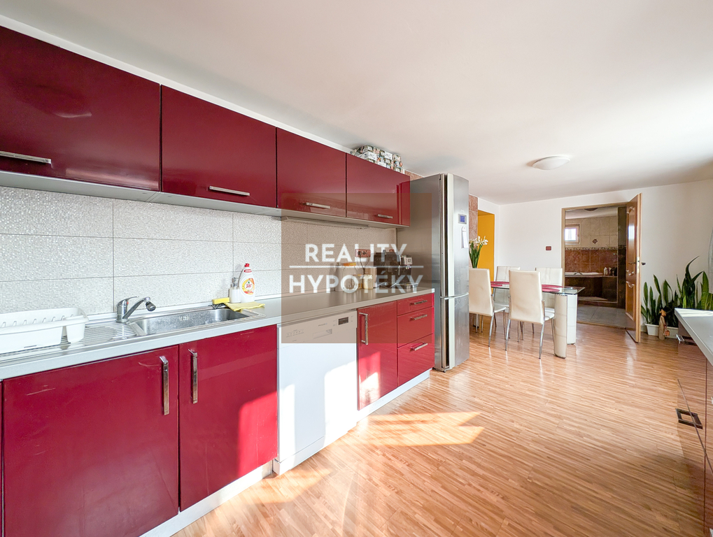 - kuchyňská linka + varná deska, digestoř, trouba, mikrovlnná trouba, lednice, myčka, stůl, židle,