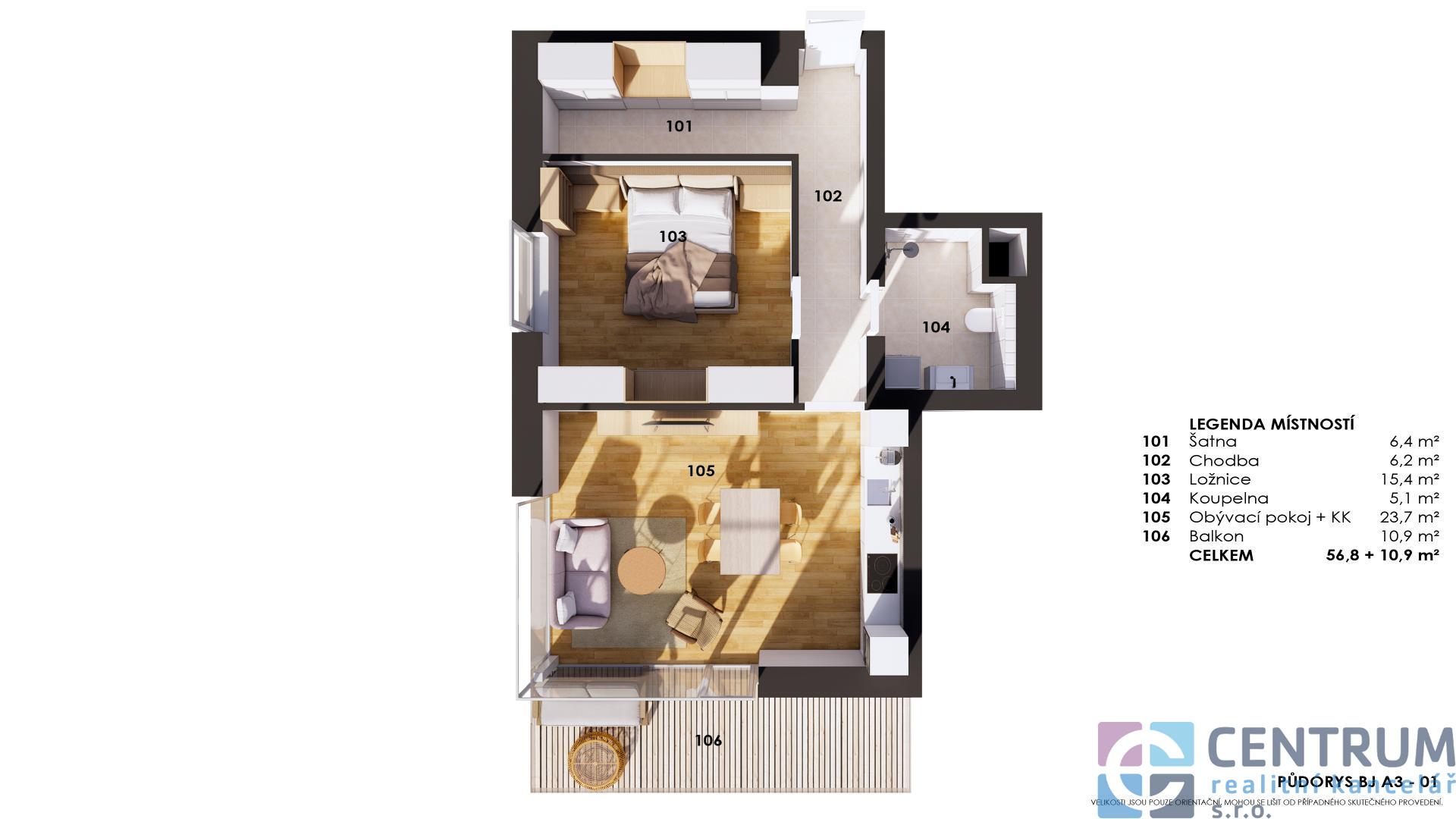 Pozor! Tento byt je prodáván vč. vybavení (kuchyňská linka, šatní skříň, zařízená koupelna + ložnice. Umožňuje tak okamžité nastěhování.