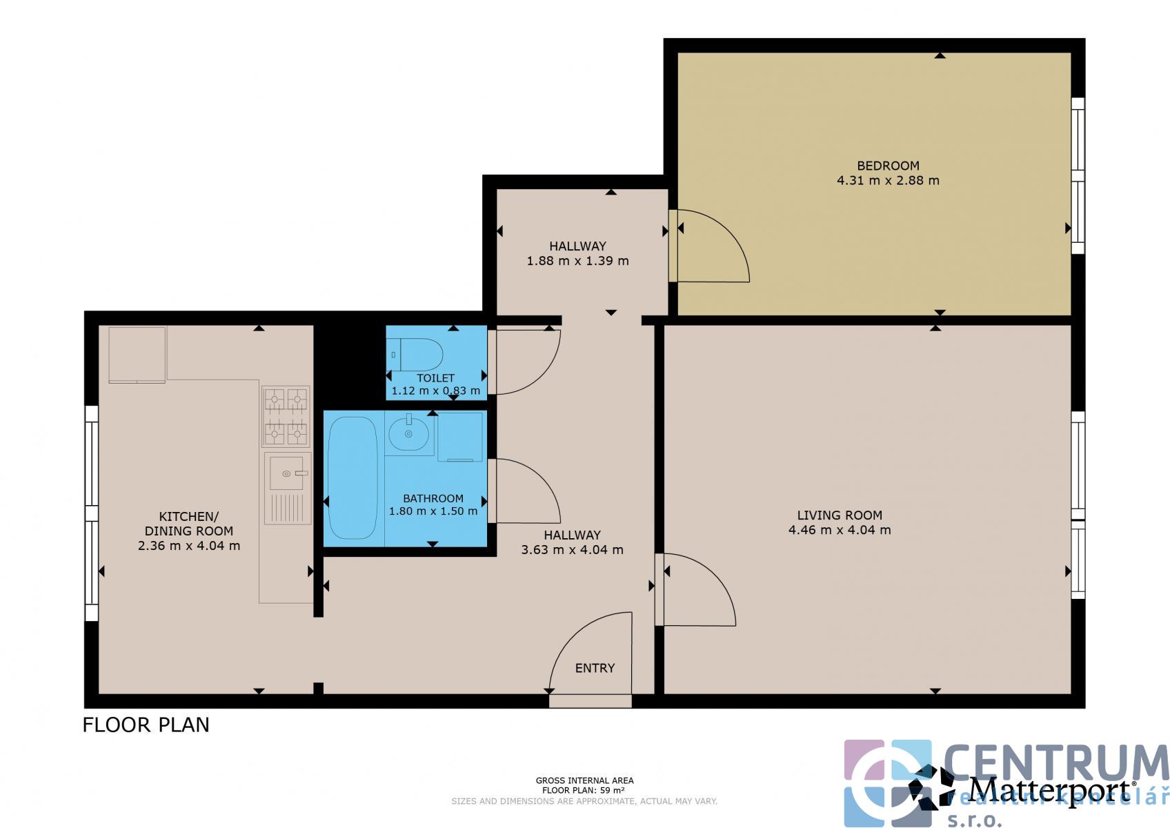 Jednotka se skládá z obývacího pokoje, ložnice, kuchyně, koupelny s vanou a samostatné toalety. Praktická dispozice skýtá mnoho místa pro skříně a úložné prostory. Díky svému uspořádání je byt vhodný pro jednotlivce nebo pár.