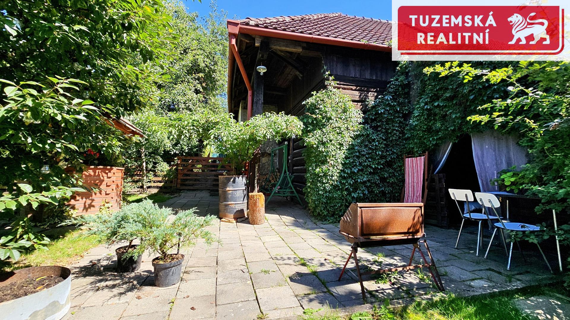 Za chalupou kryté posezení pod střechou domu, stodůlka na kola, palivové dřevo i zahradní techniku.