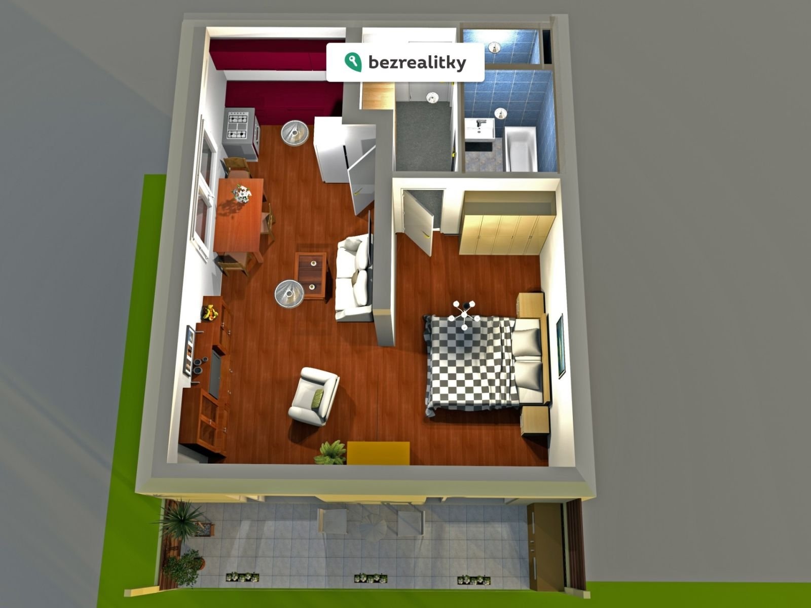 ✔ Nestandardní propojení obývacího pokoje a ložnice volným průchodem bez dveří – byt působí vzdušně, prostorně a architektonicky zajímavě. V případě potřeby lze místnosti snadno oddělit závěsem nebo mobilní příčkou.