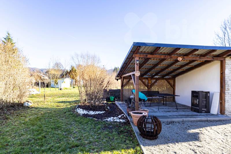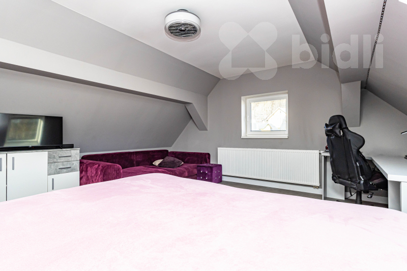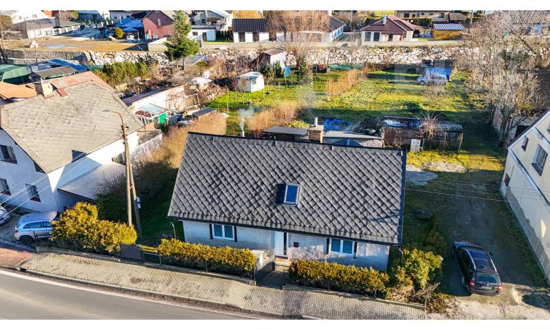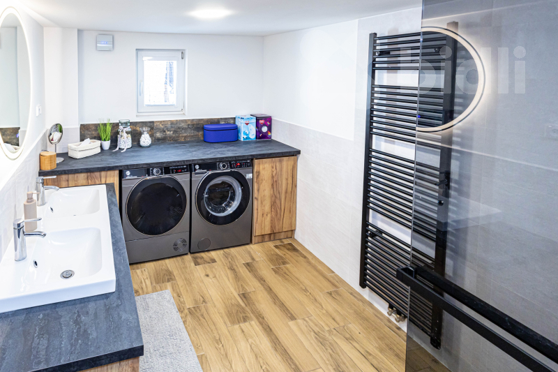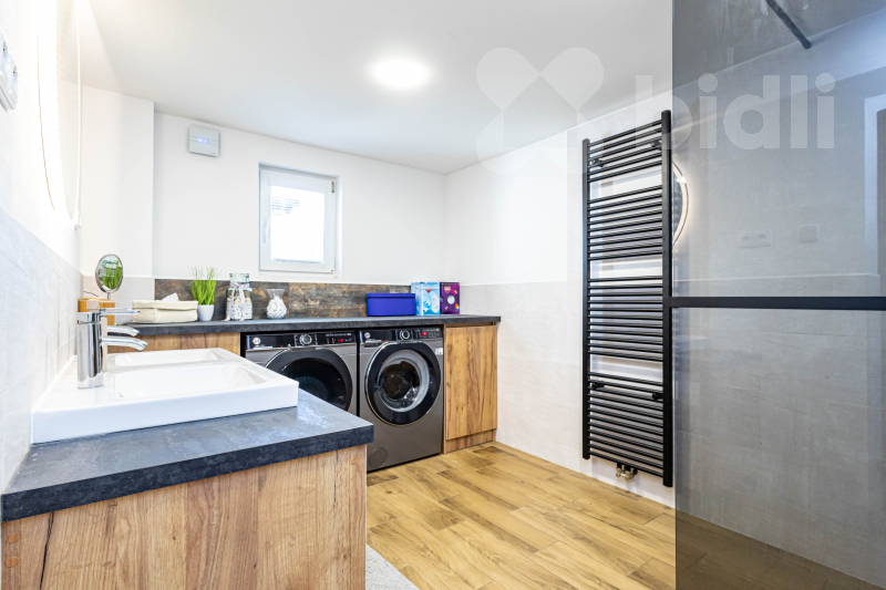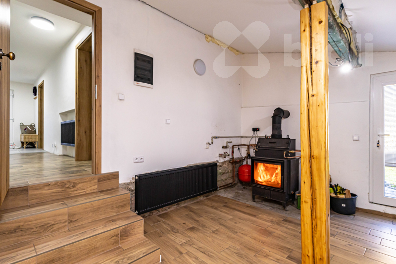 Ve sníženém suterénu se nachází technická a multifunkční část domu. Je zde podlahové vytápění (stejně jako v koupelně), krbová kamna s rozvody do ústředního topení, plynový kotel značky Baxi a bojler. Prostor lze využít například jako šatnu, technickou místnost nebo venkovní kuchyni. Ze suterénu je přímý vstup na zahradu. Dále se zde nachází praktická komora vhodná pro úklidové potřeby či vysavač. Součástí domu je samostatné WC s oknem a moderní koupelna se zapuštěným sprchovým koutem, dvěma umyvadly a koupelnovým nábytkem na míru, do kterého je elegantně integrována pračka se sušičkou. I koupelna disponuje oknem. Do patra se vstupuje po dřevěném schodišti. V horním podlaží se nachází dva velmi pěkné pokoje se šikminami, jeden z nich je vybaven klasickým i střešním oknem. Ve všech místnostech jsou bílé interiérové dveře a podlahy z lina. K domu náleží zahrada o výměře cca 723m2, na které se nachází přístavek na dřevo a prostor pro venkovní posezení. Obytná plocha domu činí přibližně 186 m2.