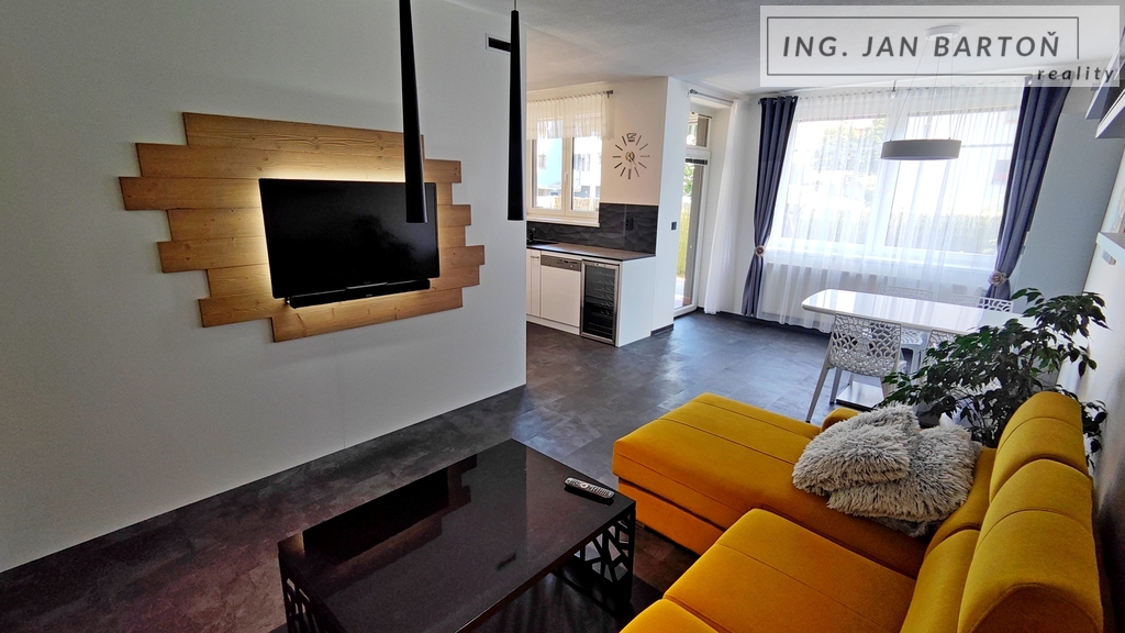 Jedinečné spojení obývacího pokoje s terasou a zahrádkou evokuje bydlení v rodinném domě, ale bez velkých starostí o něj.